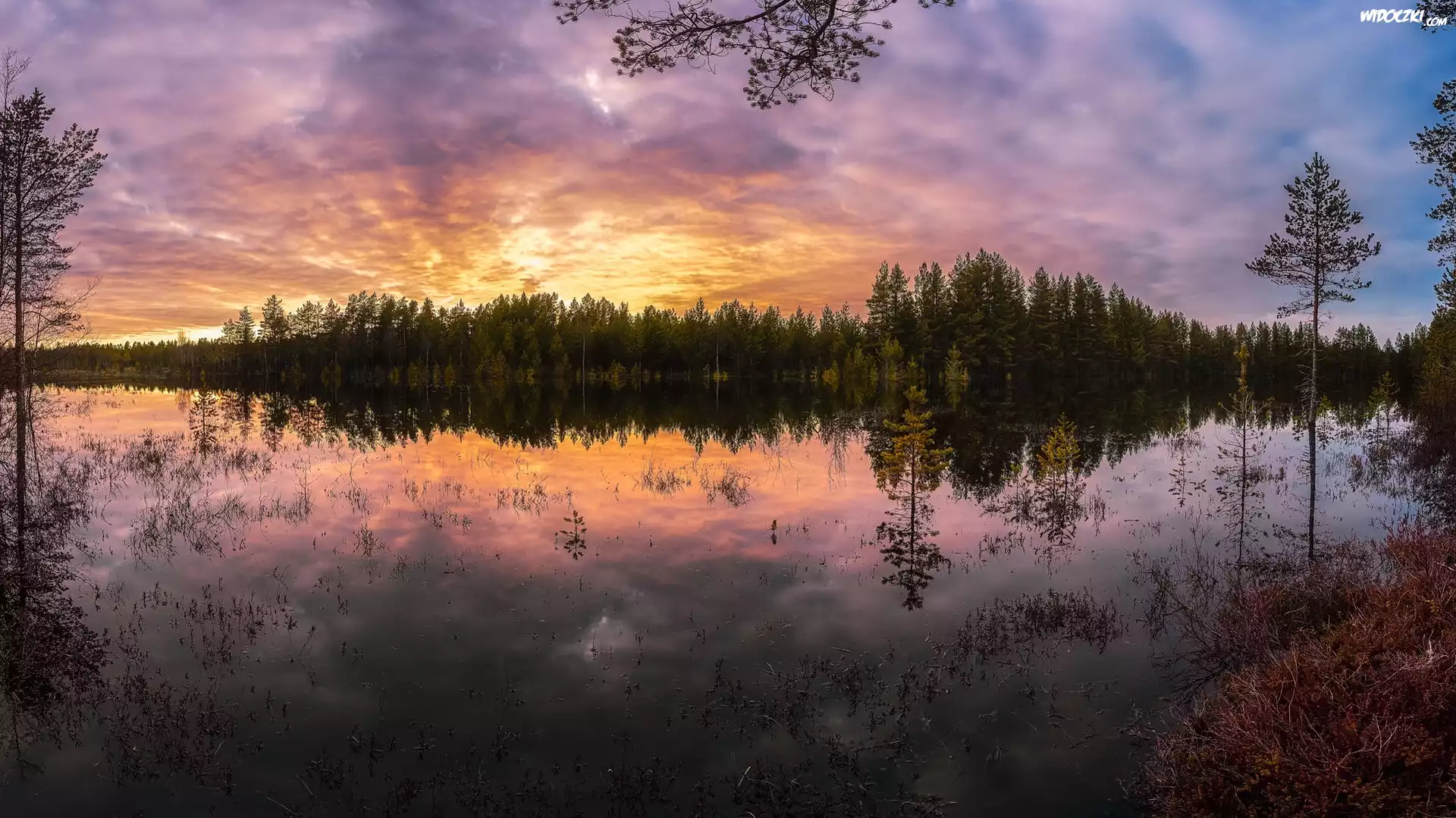 Jezioro, Las, Drzewa, Zachód słońca, Odbicie