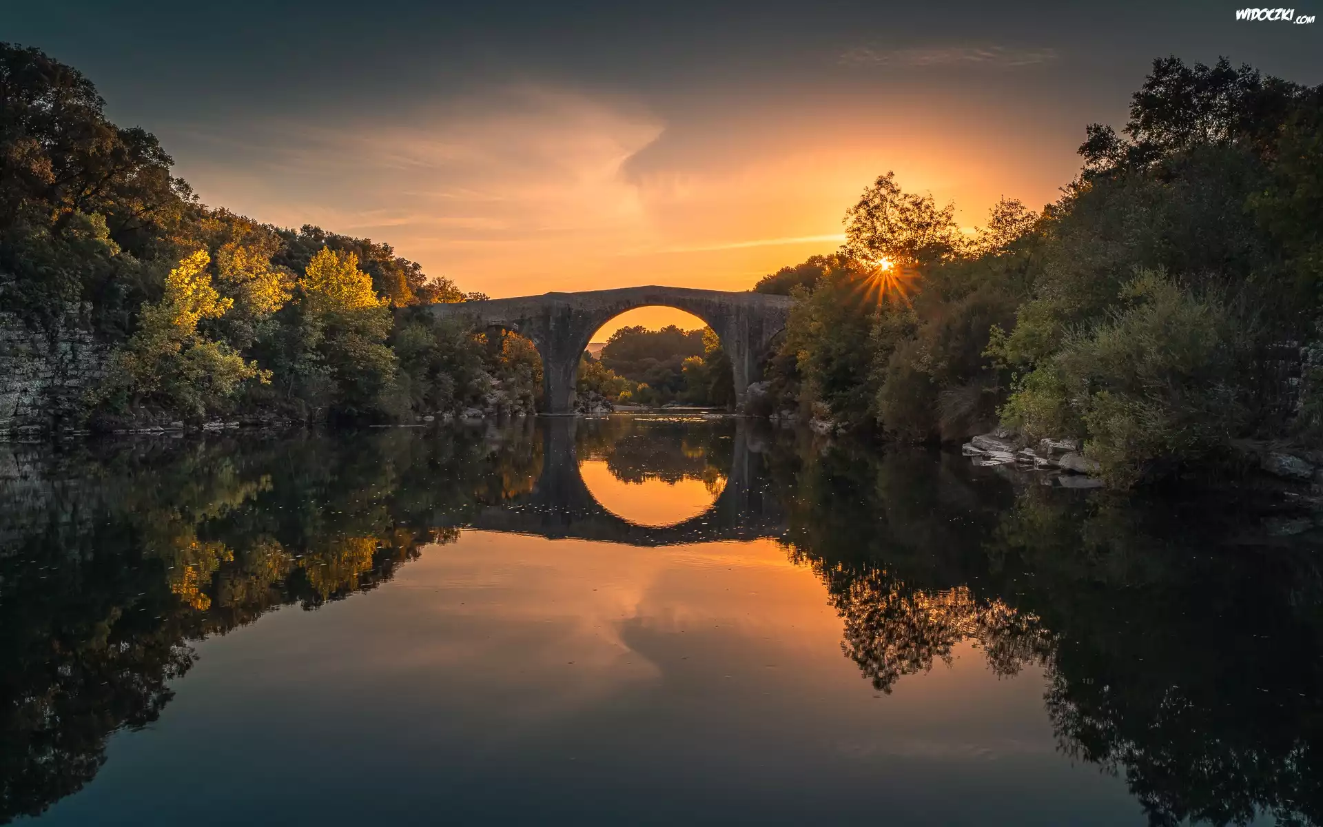 Jezioro, Most, Drzewa, Zachód słońca, Odbicie