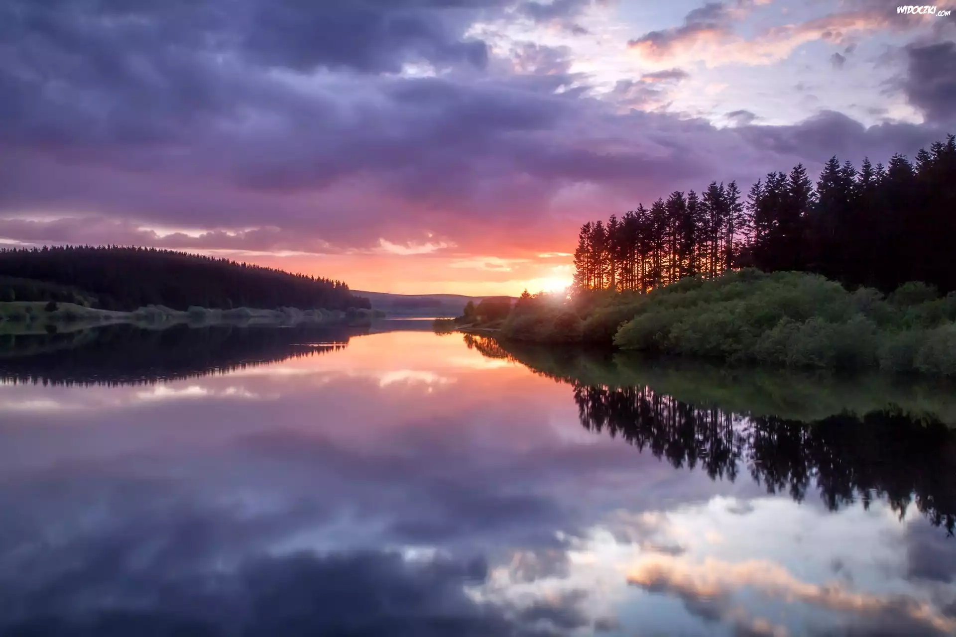Zdjęcia, Zachód, Słońca, Rzeka, Odbicie, Drzewa
