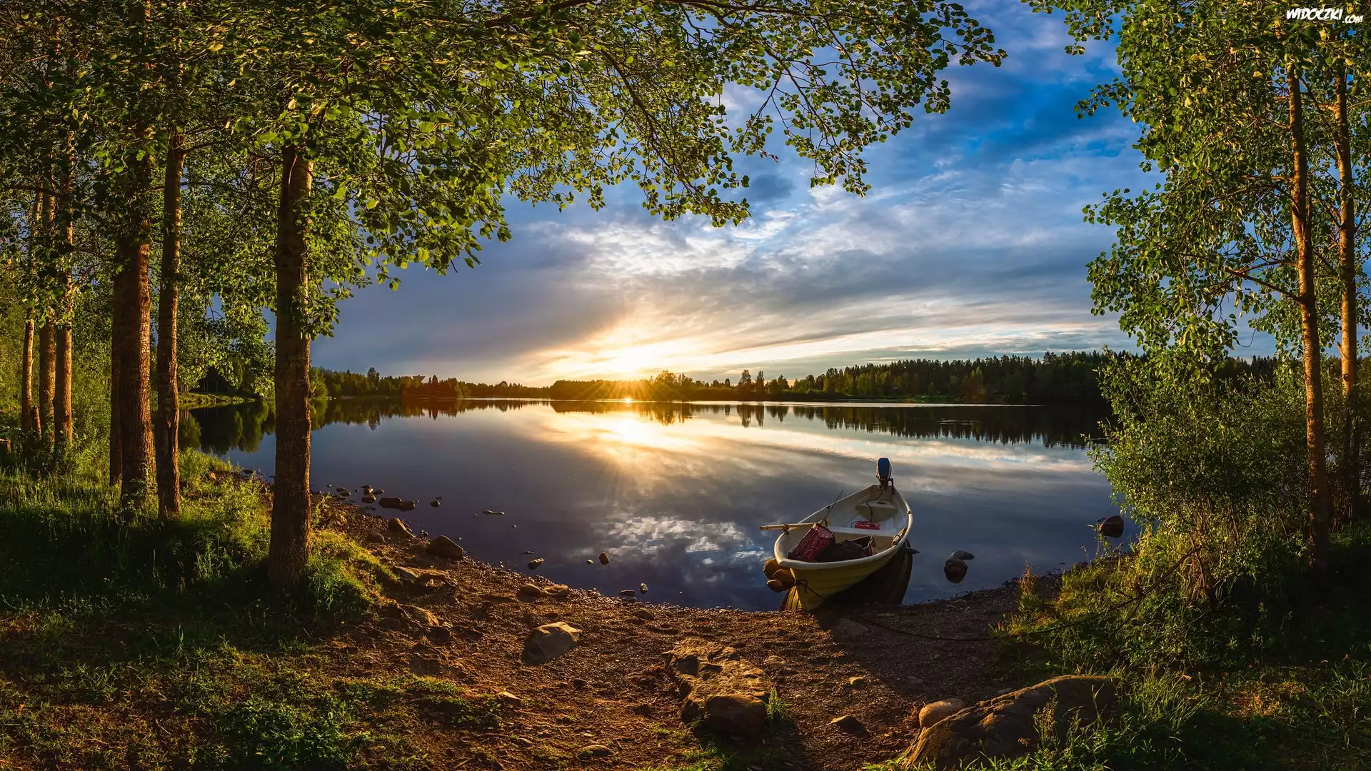 Zachód słońca, Jezioro, Łódka, Drzewa