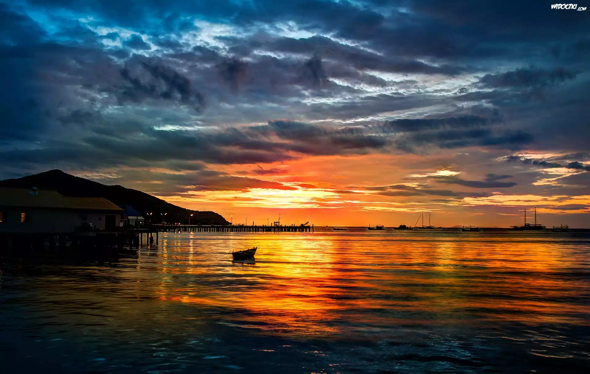 Zdjęcia, Zachód, Słońca, Morze, Łódka, Góry