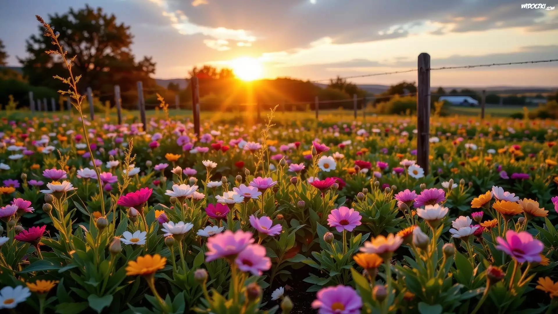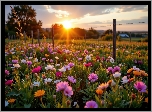 Zdjęcia, Łąka, Kolorowe, Kwiaty, Zachód słońca, Ogrodzenie
