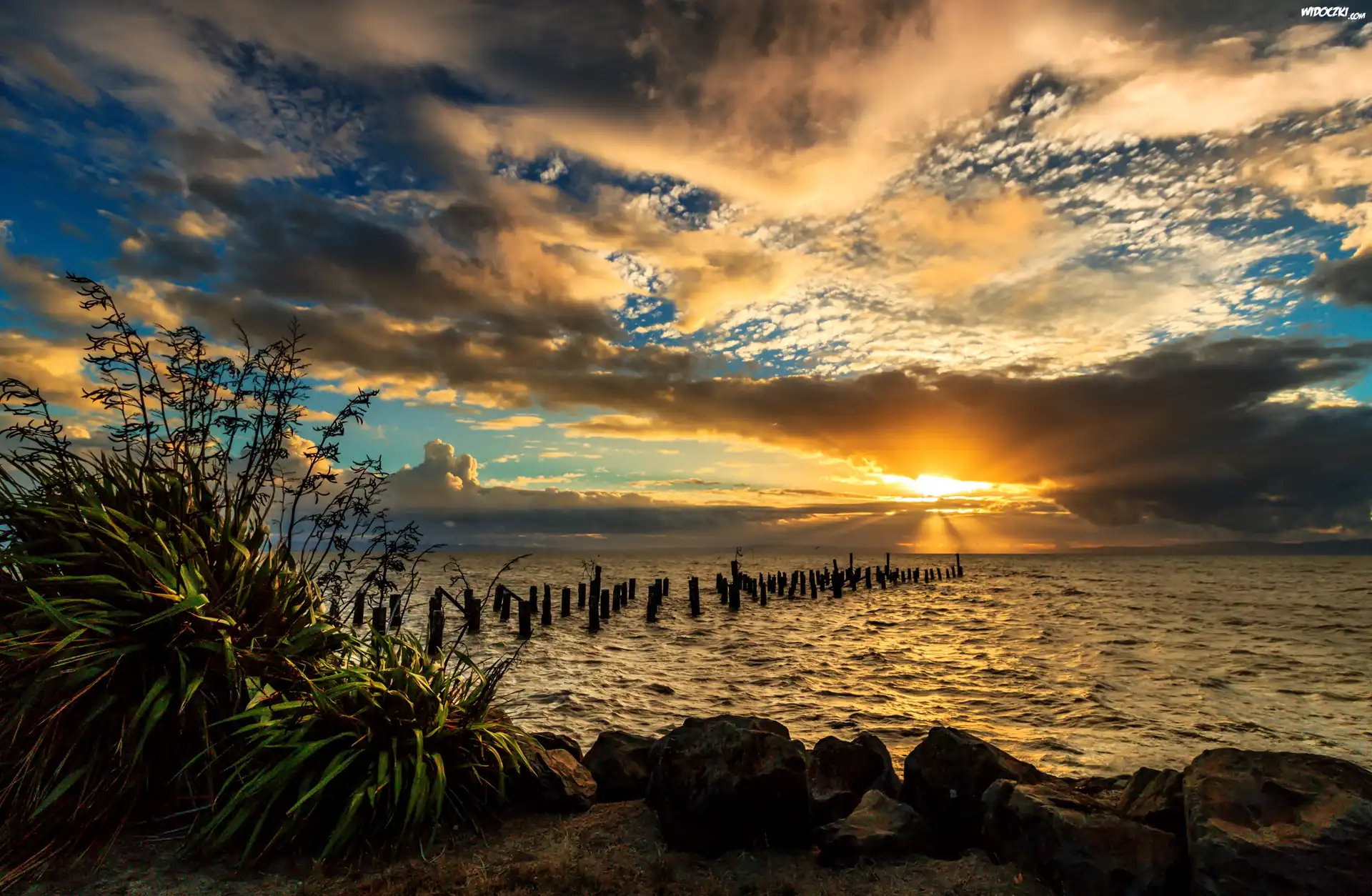 Zdjęcia, Zachód słońca, Morze, Pale, Rośliny