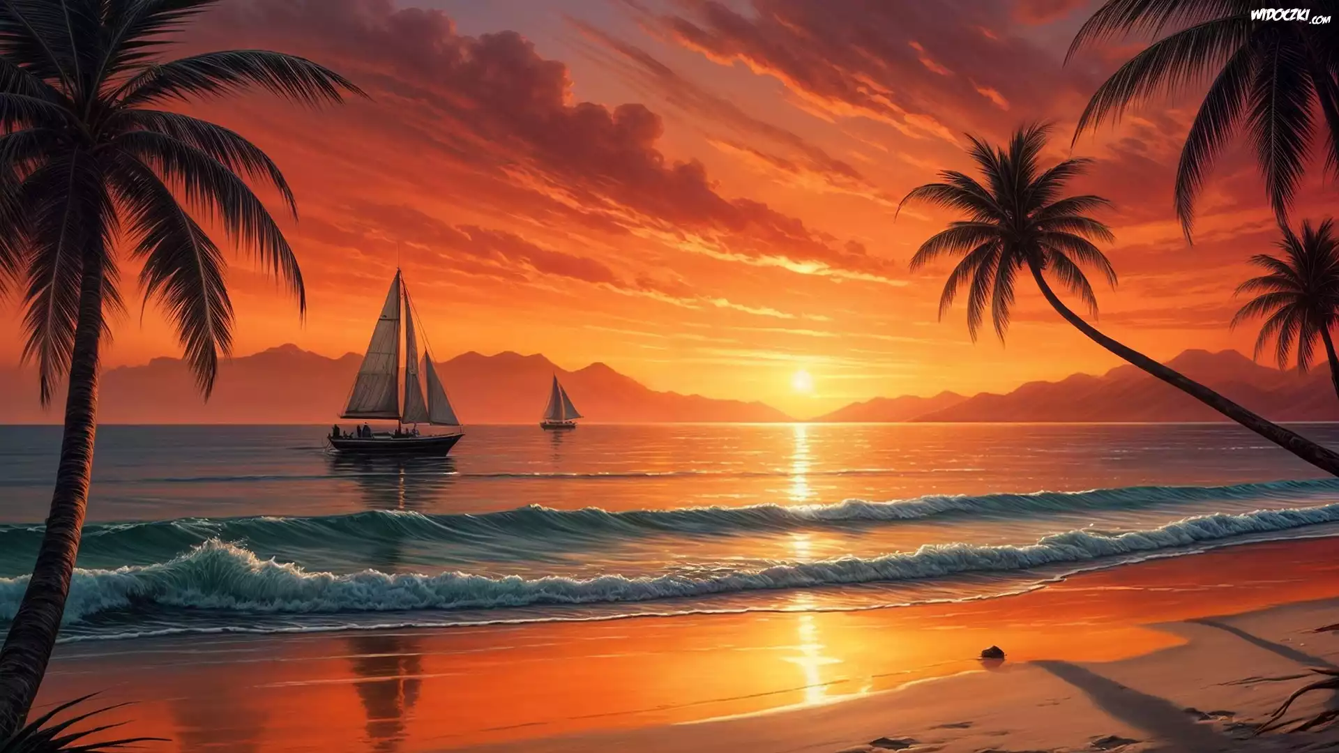 Zdjęcia, Morze, Plaża, Palmy, Zachód Słońca, Żaglówki, Grafika