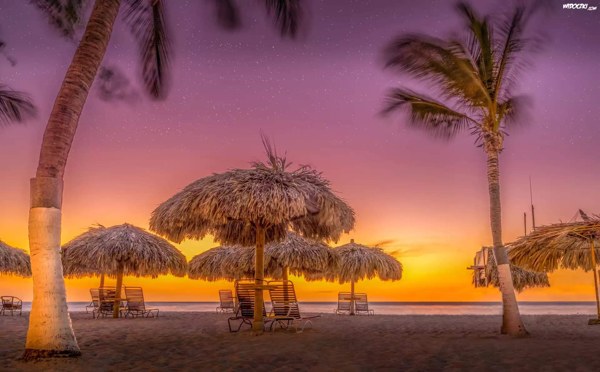 Zachód słońca, Plaża, Palmy, Leżaki, Wakacje