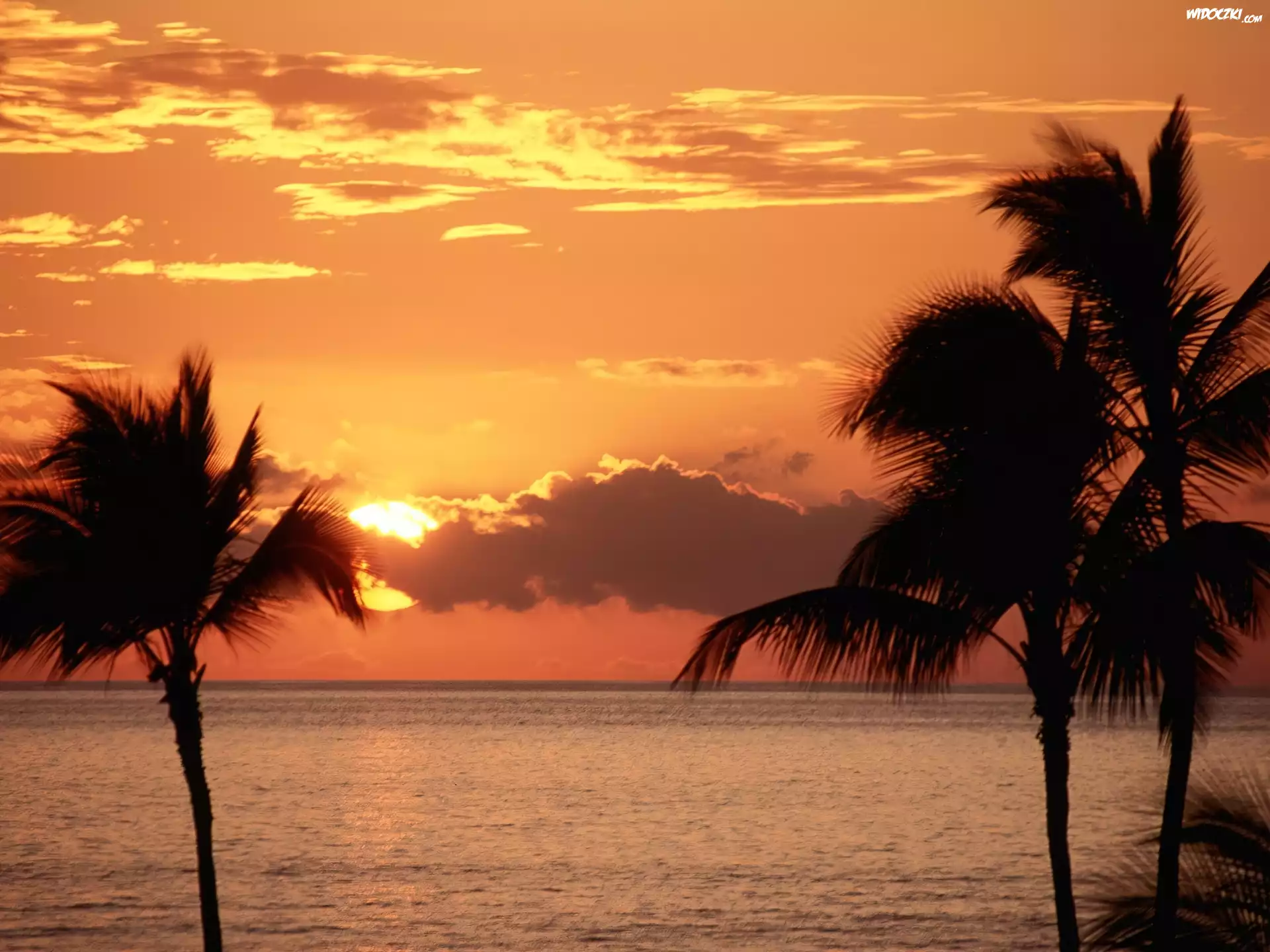 Zdjęcia, Zachód, Słońce, Promienie, Palmy, Morze