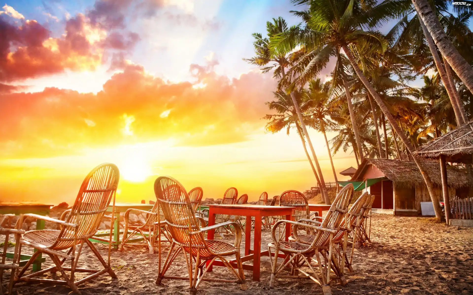 Zdjęcia, Zachód, Słońca, Palmy, Fotele