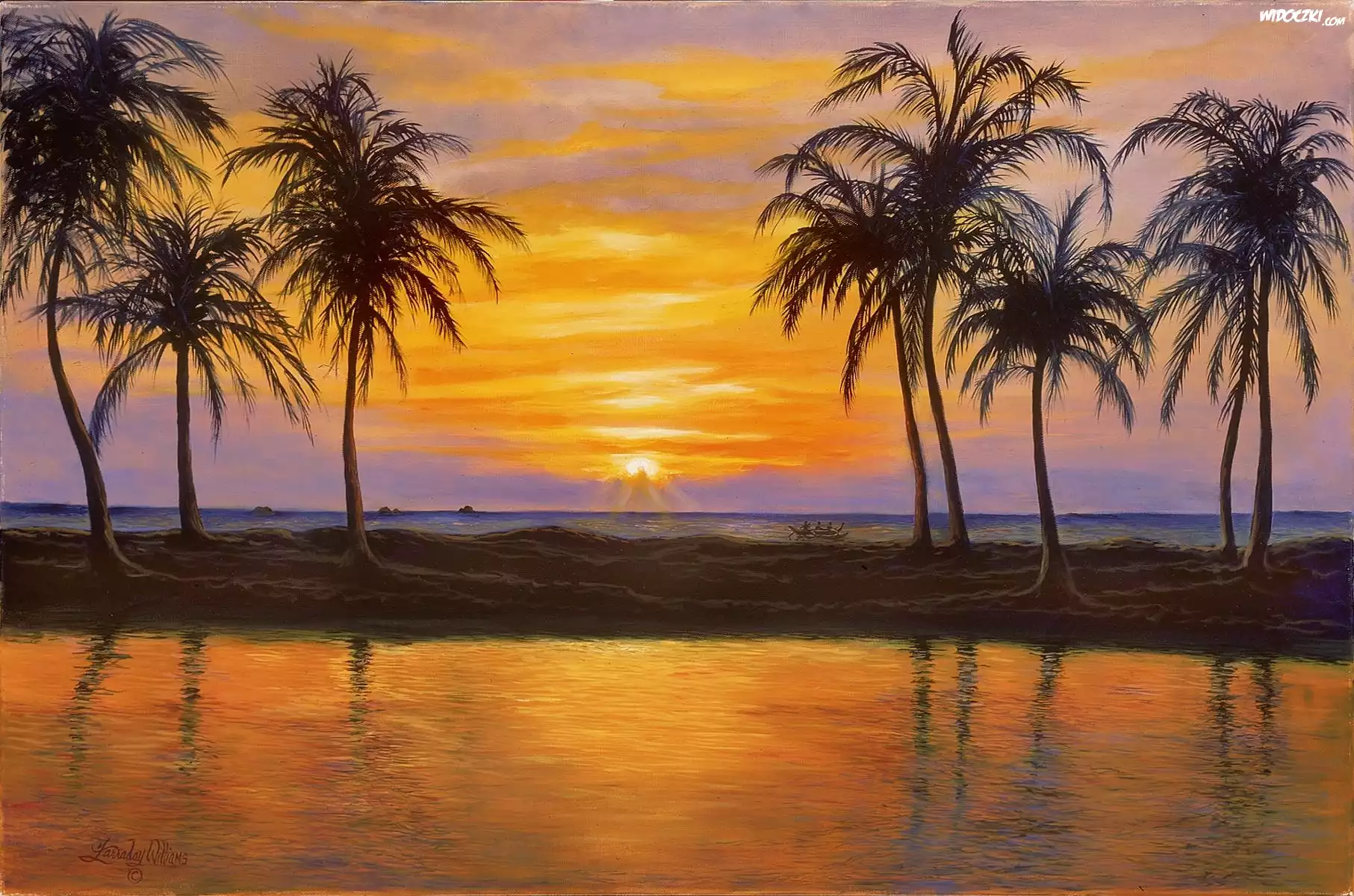 Zdjęcia, Zachód Słońca, Palmy, Woda