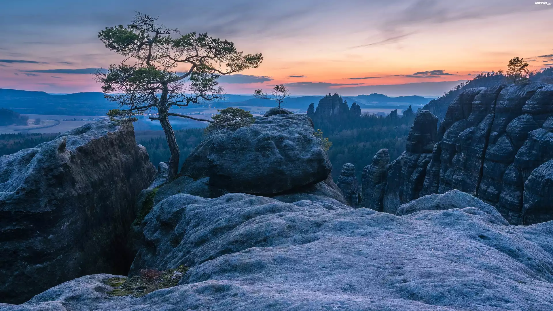 Zdjęcia, Park Narodowy Saskiej Szwajcarii, Niemcy, Zachód Słońca, Skały, Drzewo, Góry Połabskie, Sosna