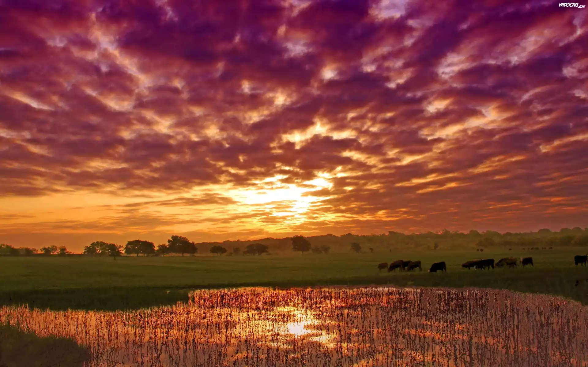 Zachód, Słońca, Chmury, Łąki, Pastwisko, Krowy
