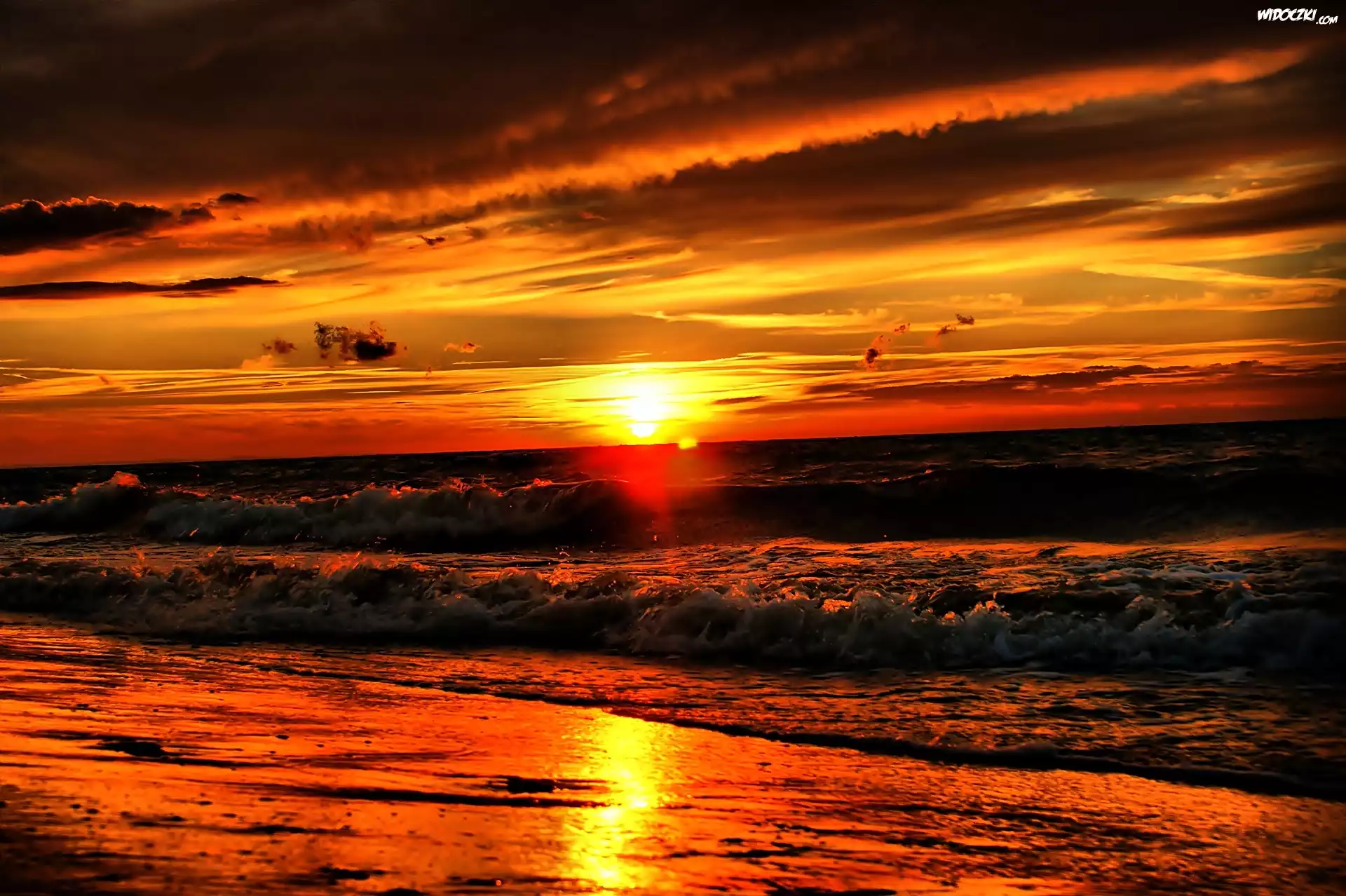 Zdjęcia, Zachód Słońca, Chmury, Plaża, Morze