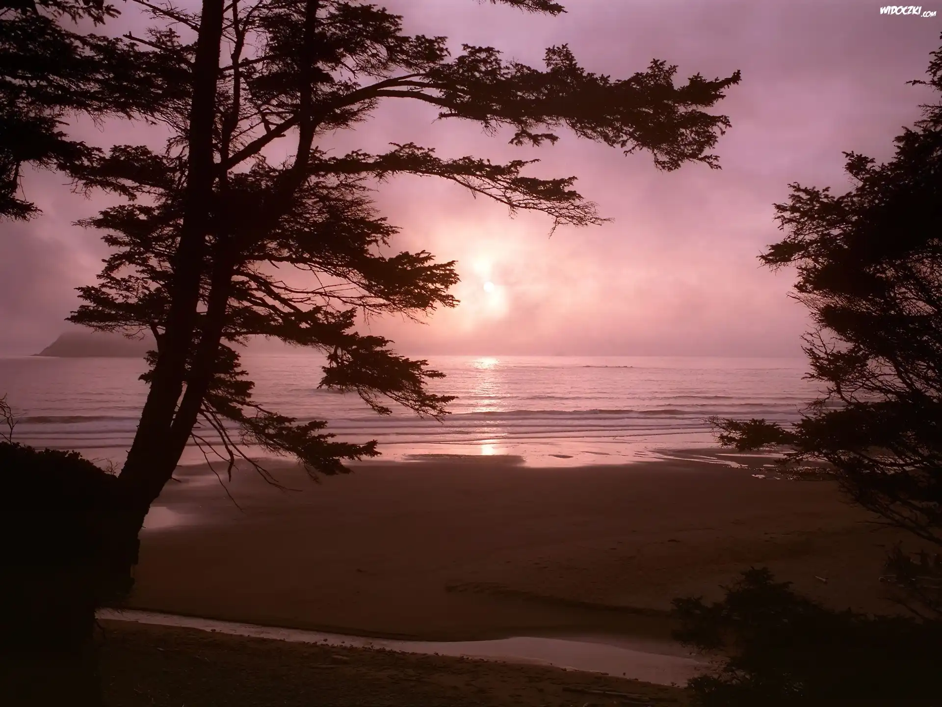 Zdjęcia, Zachód, Słońca, Jezioro, Plaża, Drzewa