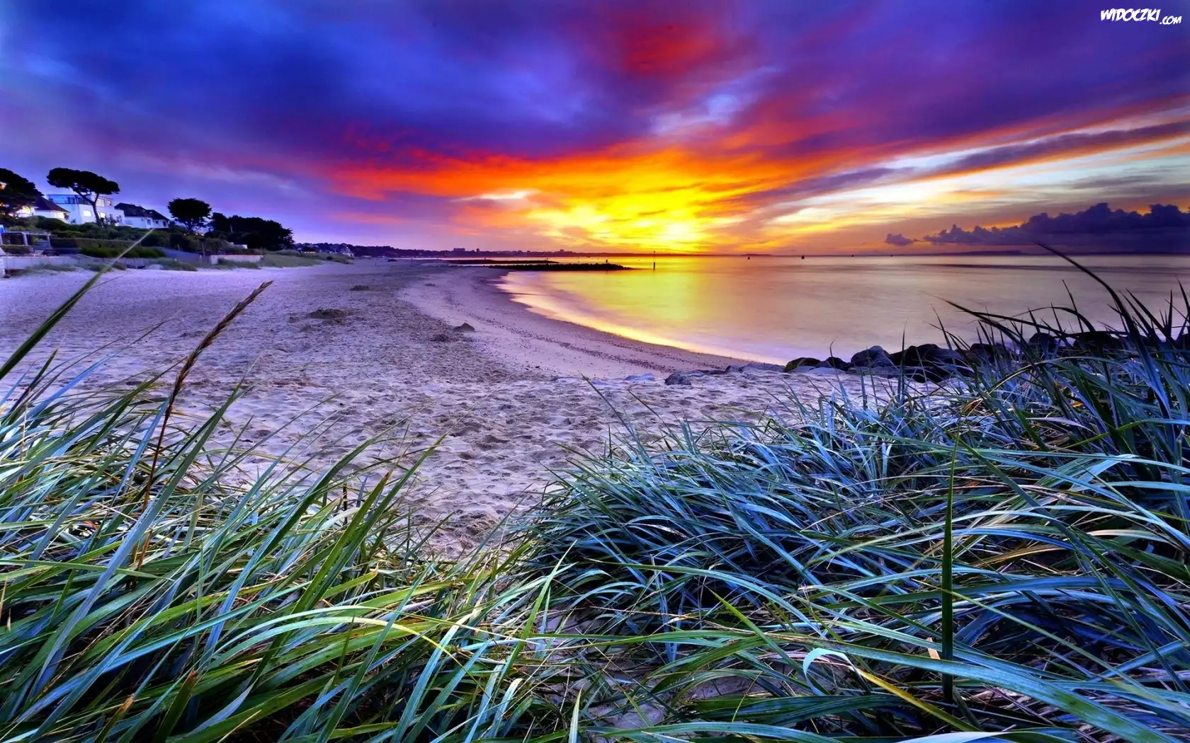 Zdjęcia, Zachód, Jezioro, Plaża, Trawa