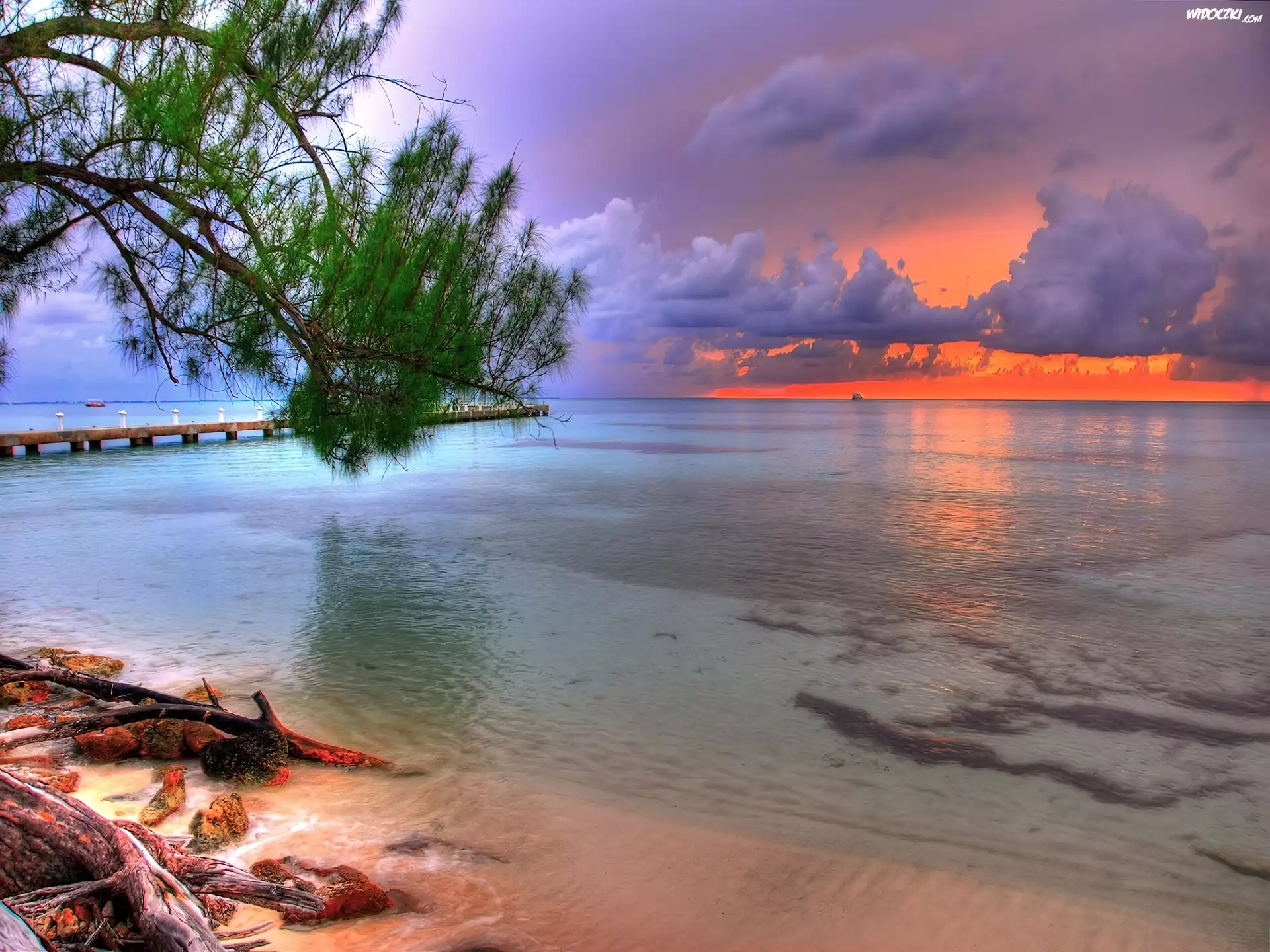 Zachód, Słońca, Morze, Molo, Plaża, Sosna