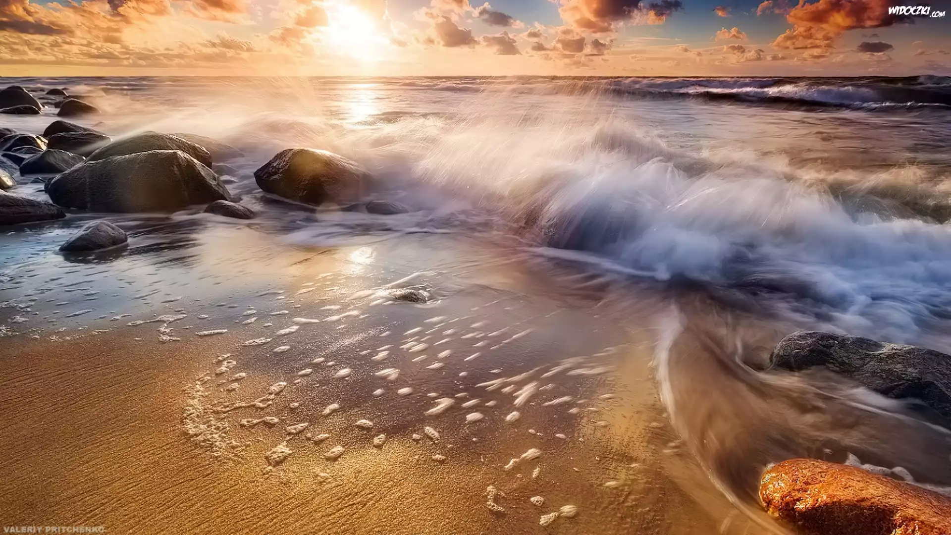 Zdjęcia, Zachód, Słońca, Morze, Plaża, Fale