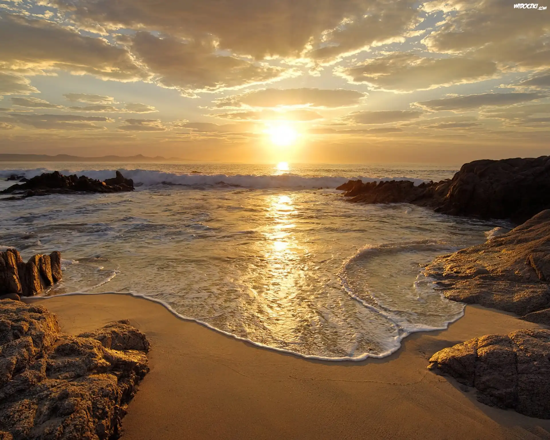 Zdjęcia, Zachód, Słońca, Morze, Plaża, Fale