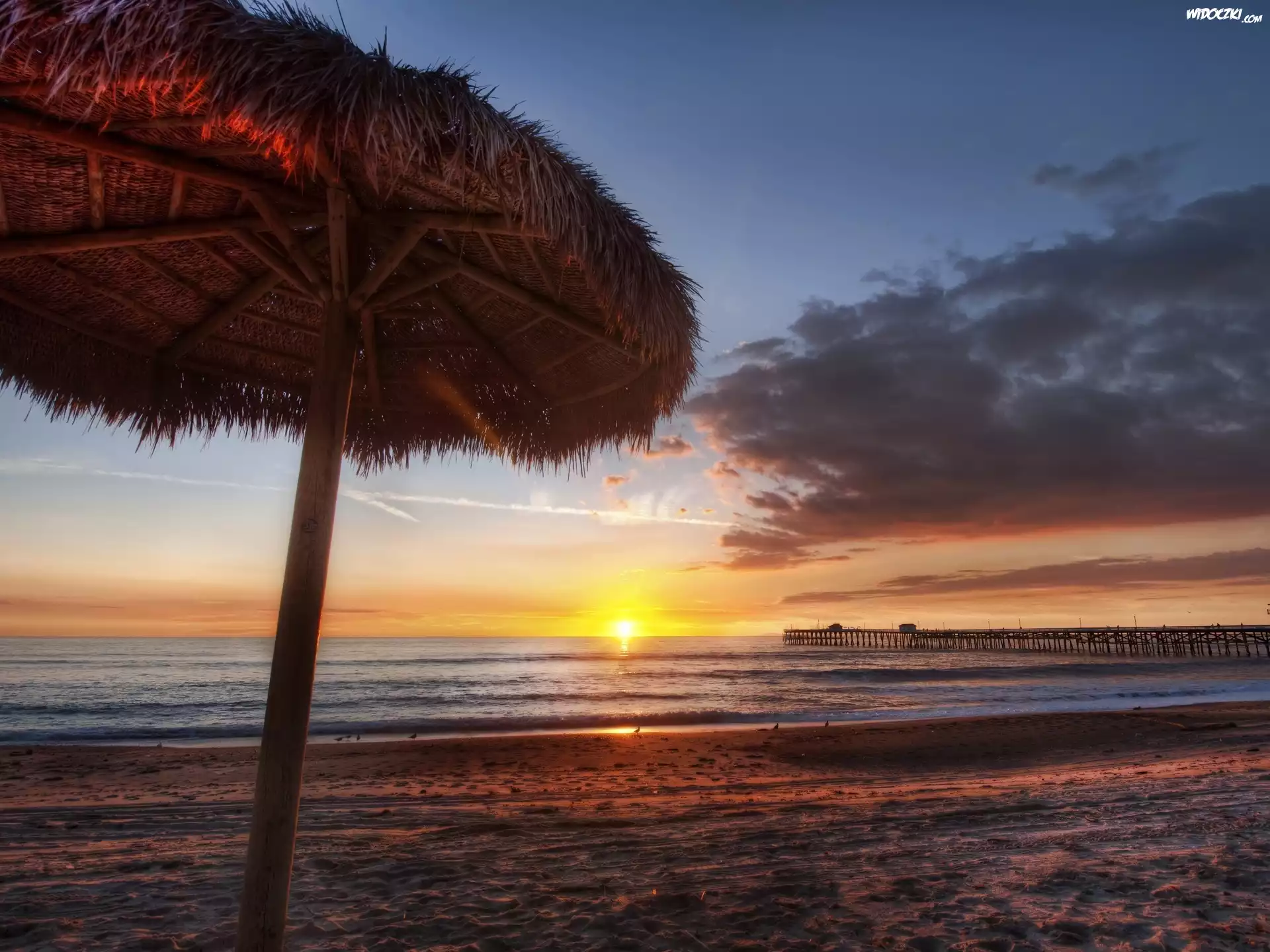Zdjęcia, Zachód, Słonca, Morze, Plaża, Parasol