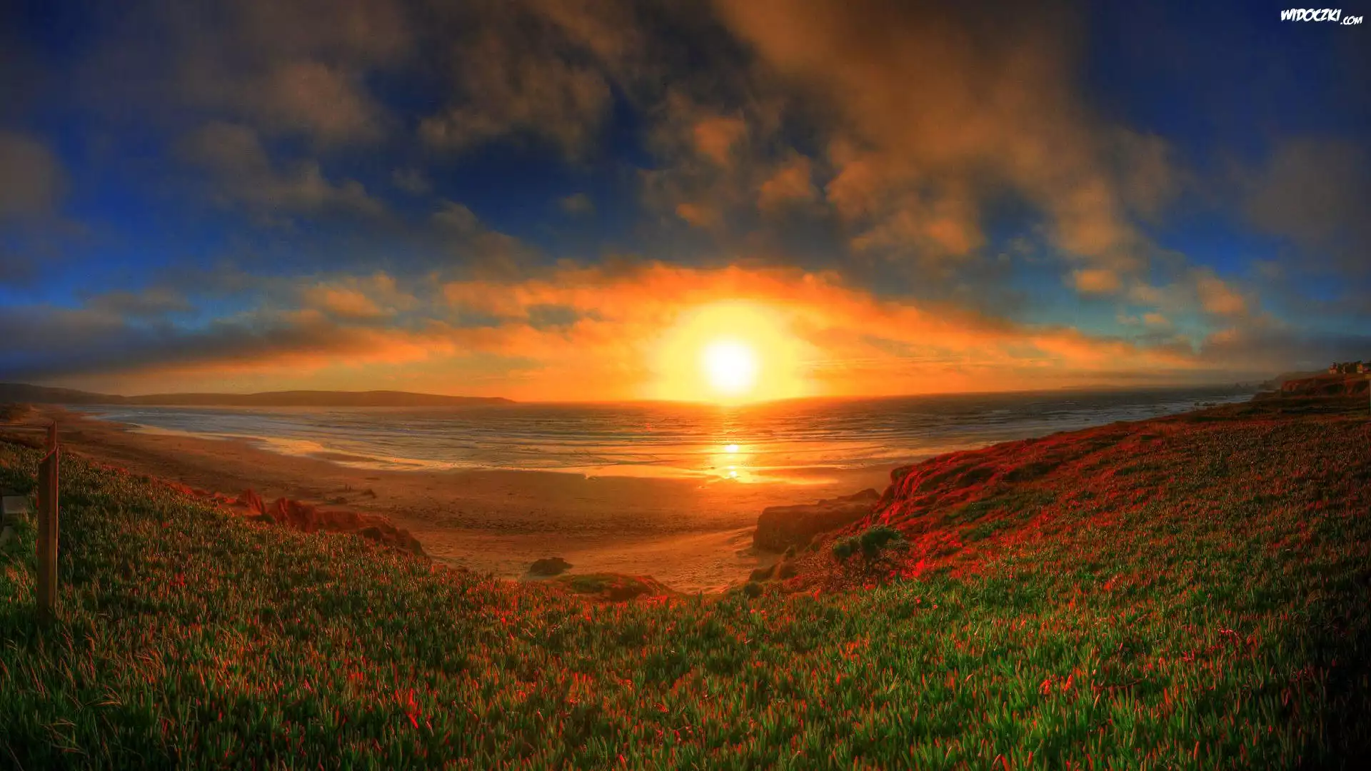 Zdjęcia, Zachód, Słońca, Plaża, Kwiaty