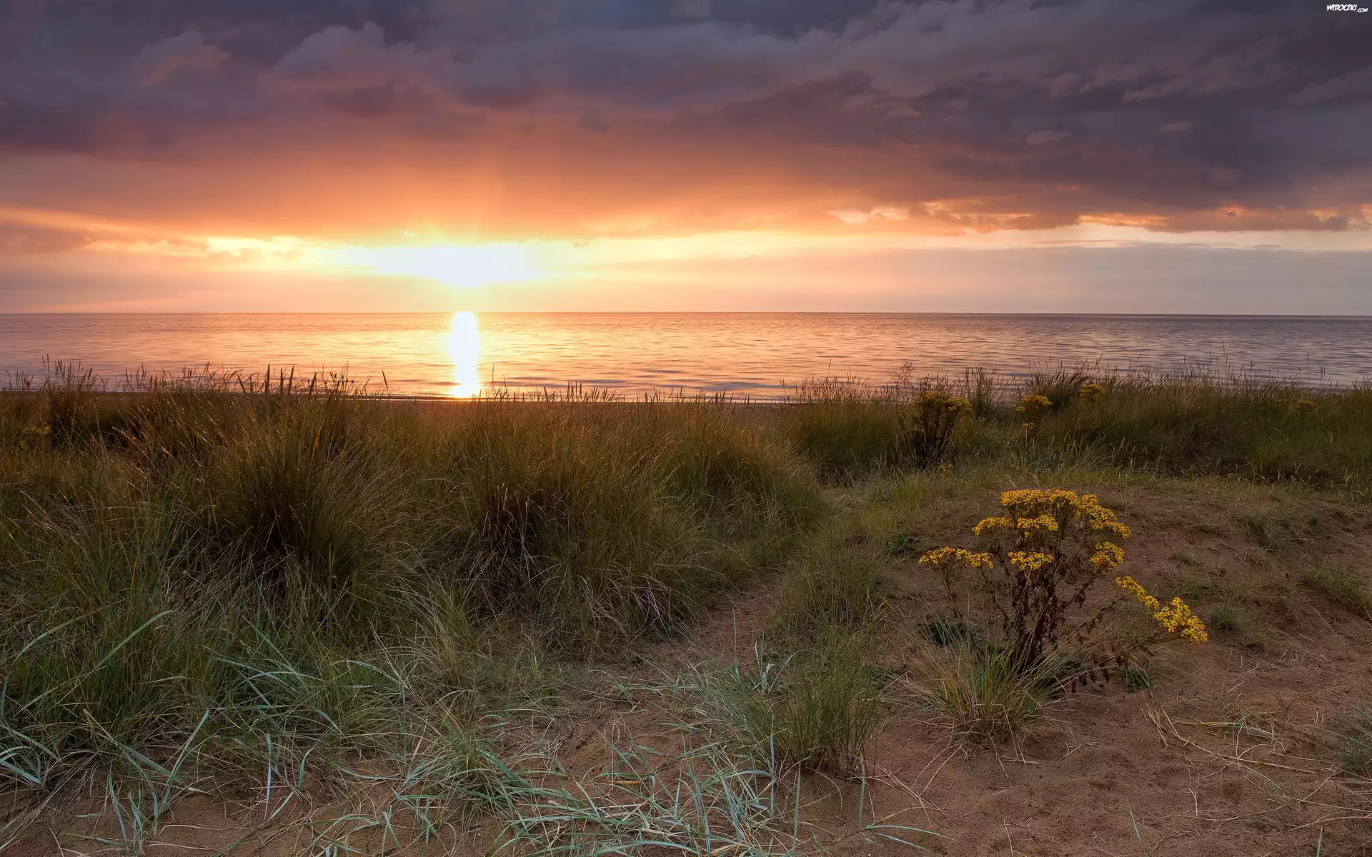 Zdjęcia, Zachód, Słońca, Plaża, Roślinność