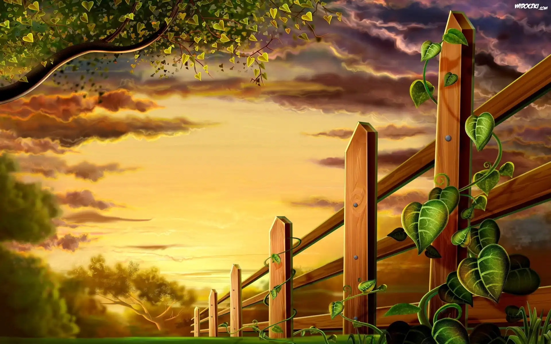 Zdjęcia, Zachód, Słońca, Płot, Liście