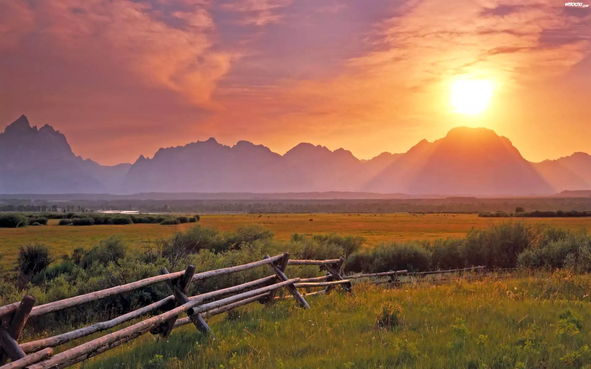 Zdjęcia, Łąka, Płotek, Góry, Zachód Słońca