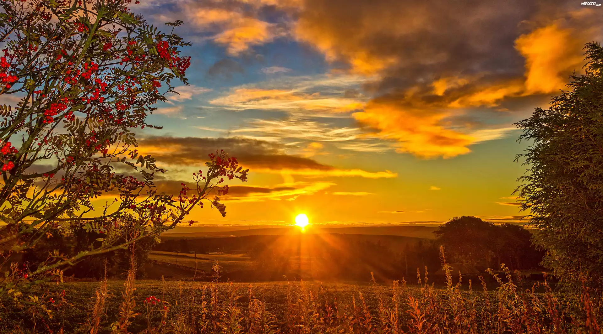 Zachód, Słońca, Łąki, Pola, Krzewy