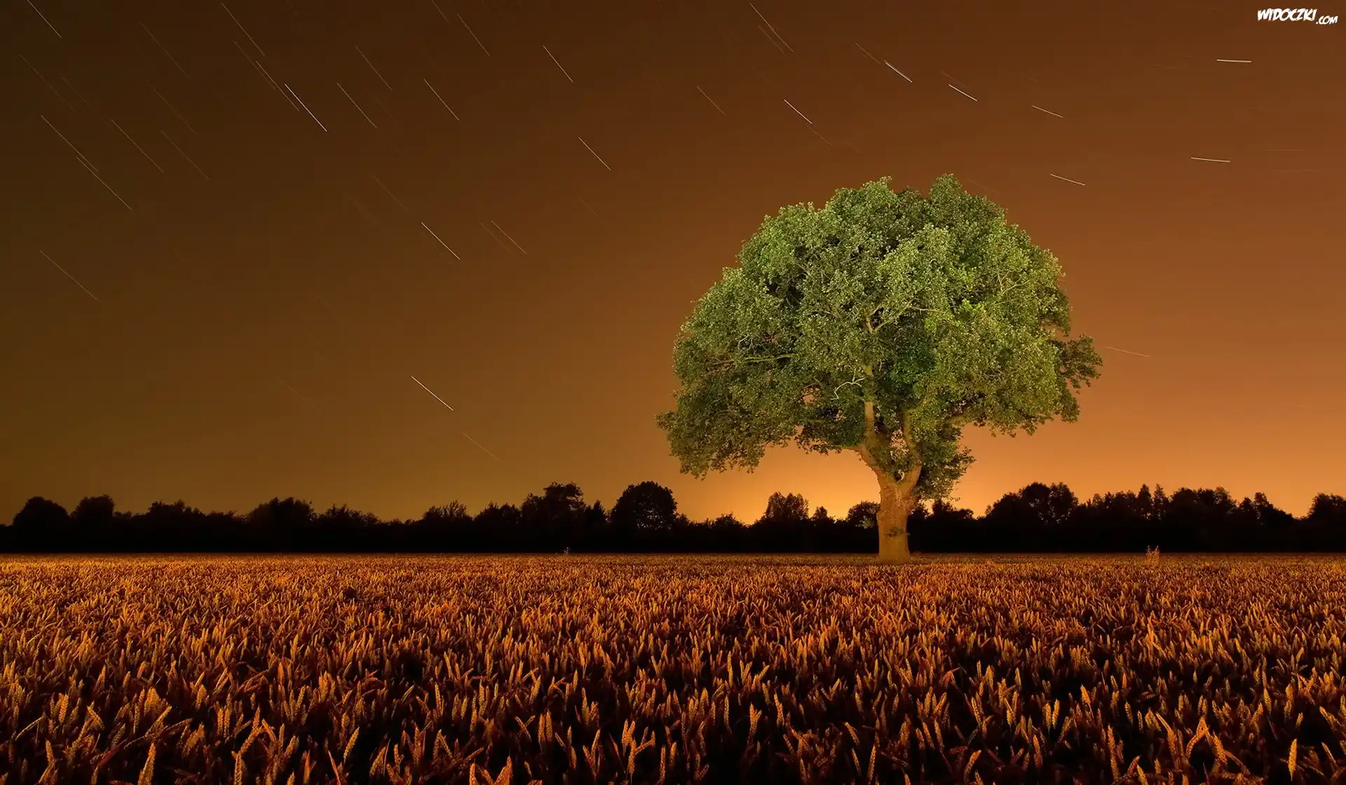 Zachód Słońca, Drzewo, Pola, Zboża