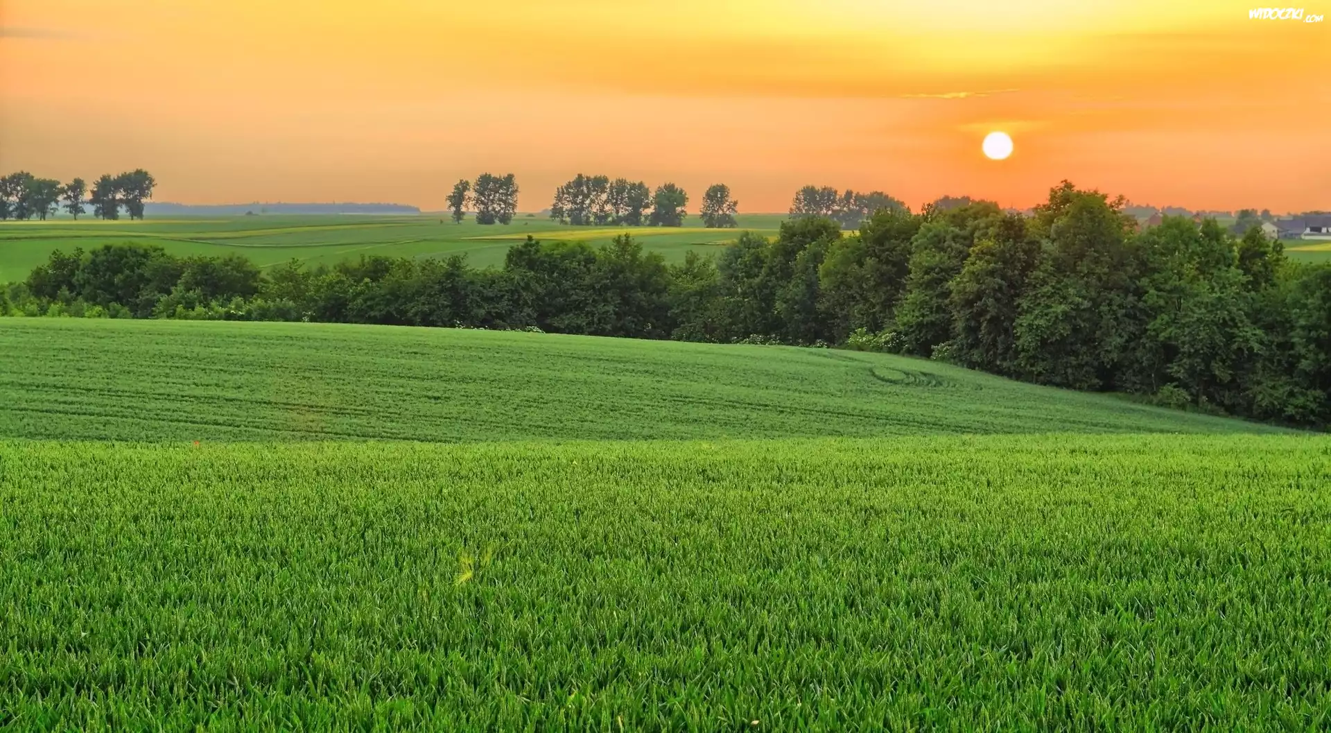 Zdjęcia, Zachód, Słońca, Pola, Drzewa