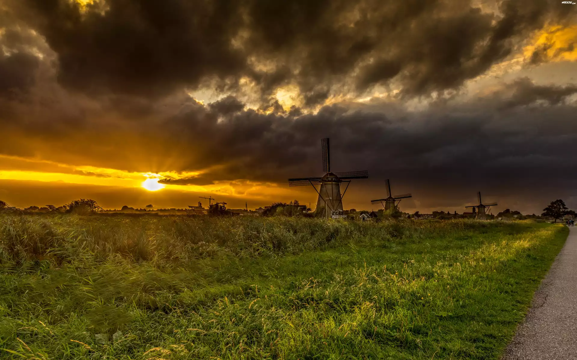 Zdjęcia, Zachód słońca, Chmury, Pole, Wiatraki