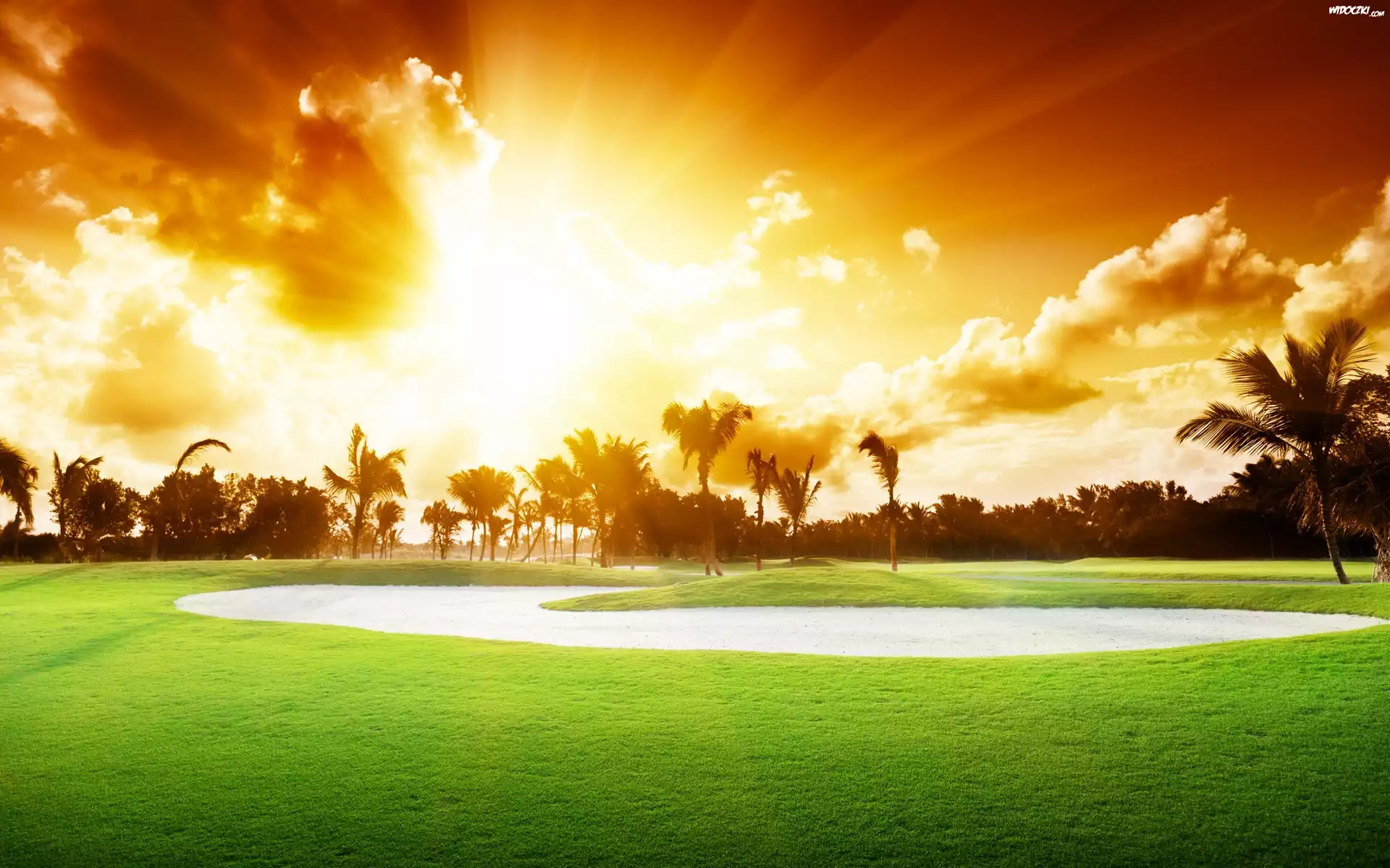 Zdjęcia, Zachód, Słońca, Palmy, Pole, Golfowe