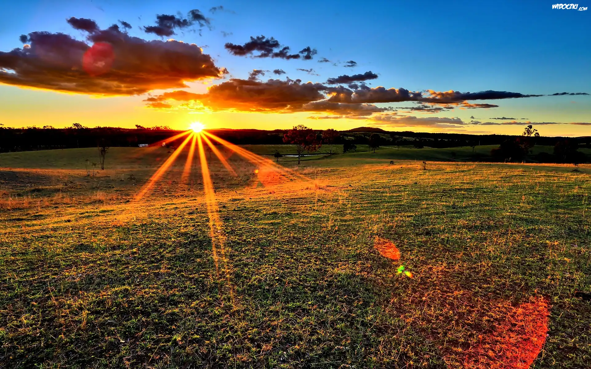 Zdjęcia, Zachód Słońca, Promienie, Pole, Chmury