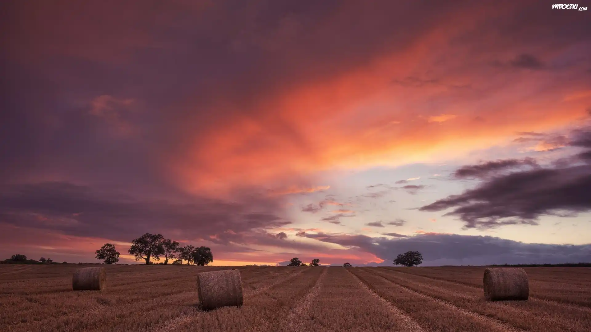 Zdjęcia, Zachód słońca, Pole, Drzewa