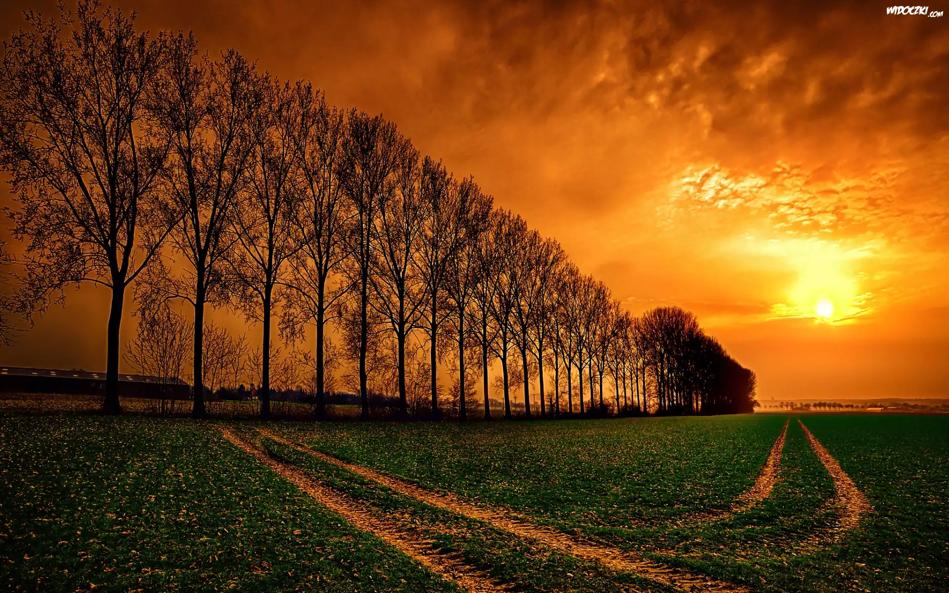 Zdjęcia, Zachód, Słońca, Pole, Drzewa