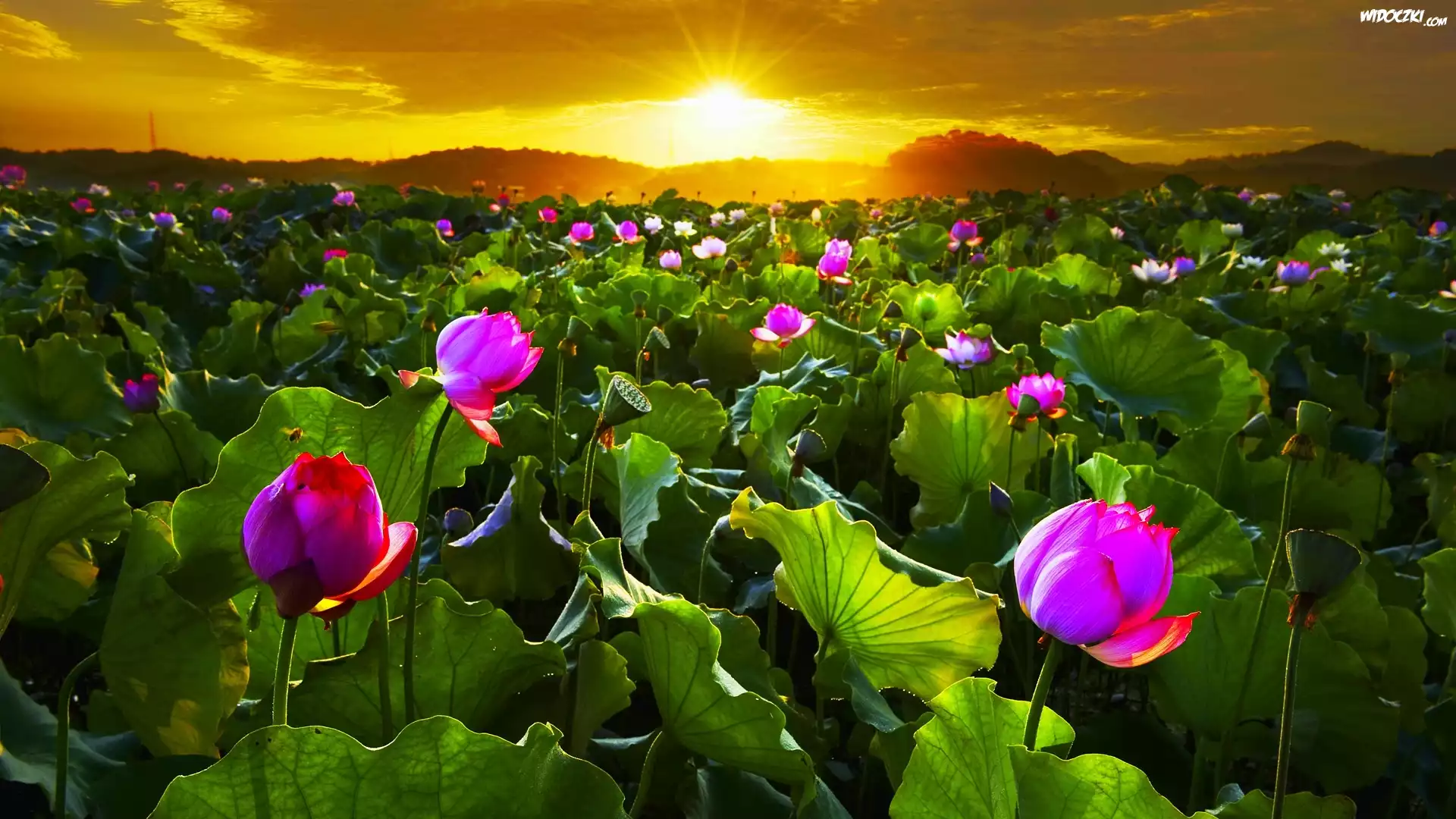 Zdjęcia, Zachód, Słońca, Pole, Kwiatów