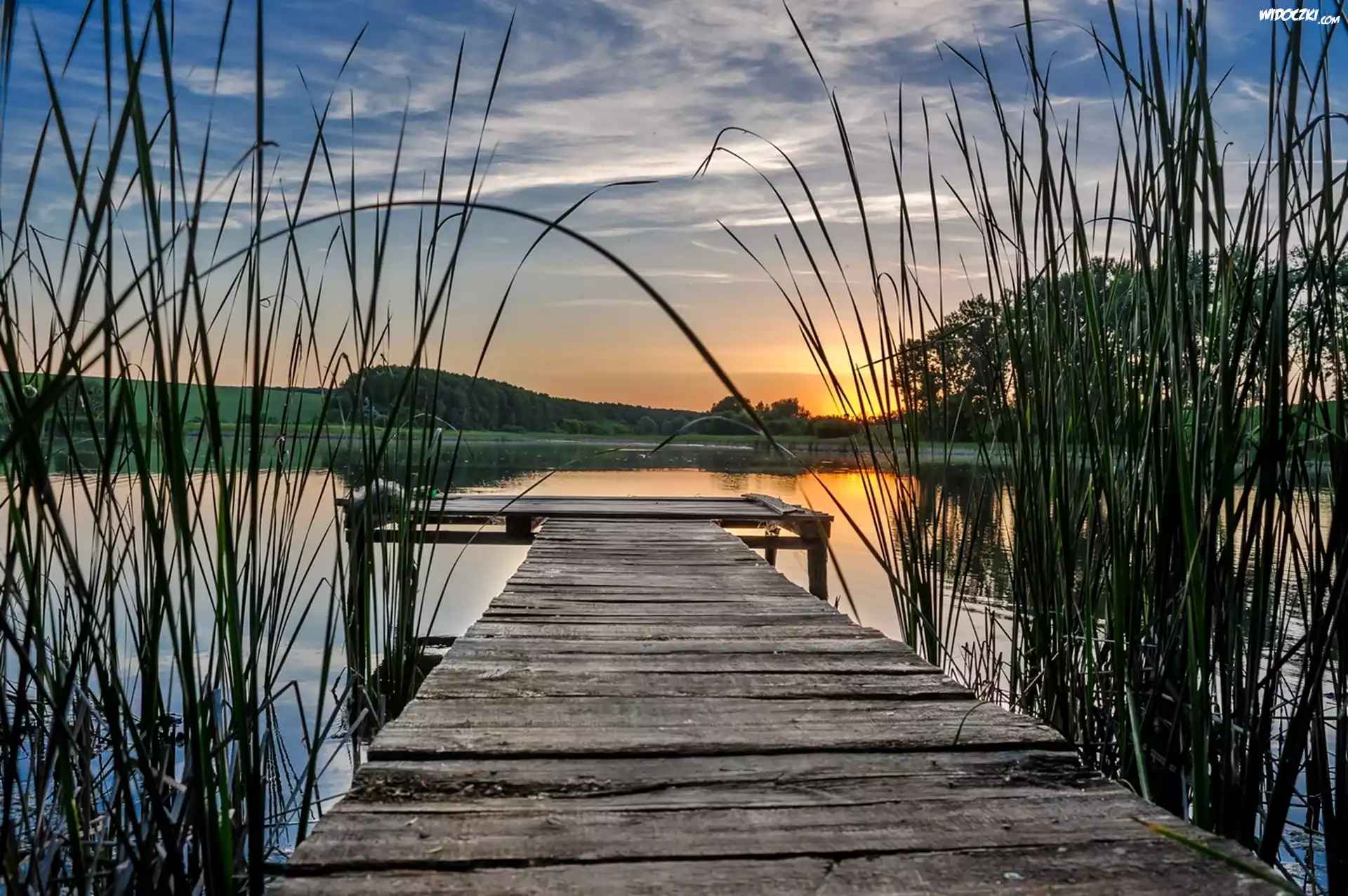 Zdjęcia, Zachód Słońca, Jezioro, Pomost, Rosliny