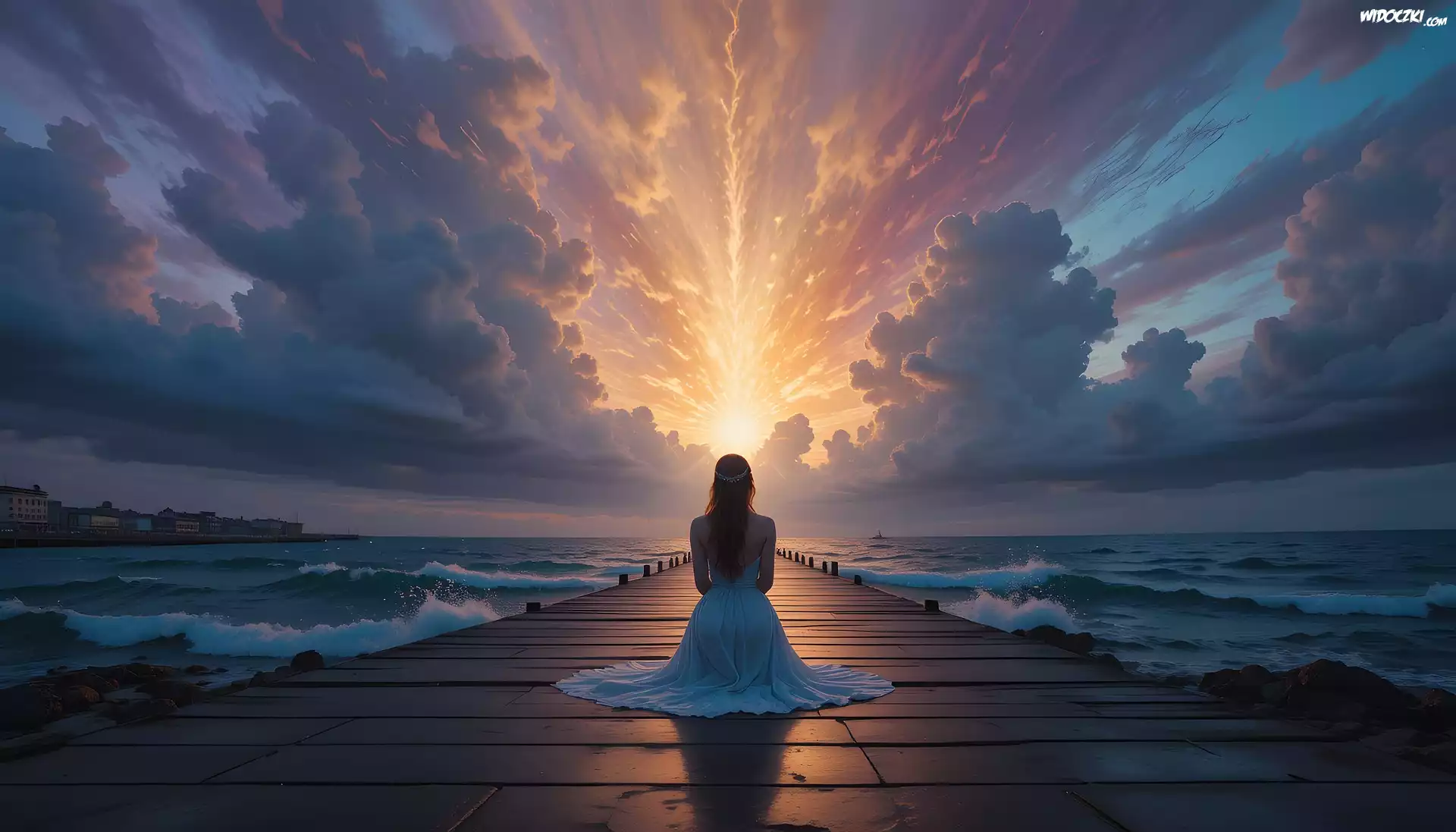 Kobieta, Morze, Pomost, Zachód słońca, Chmury, Grafika
