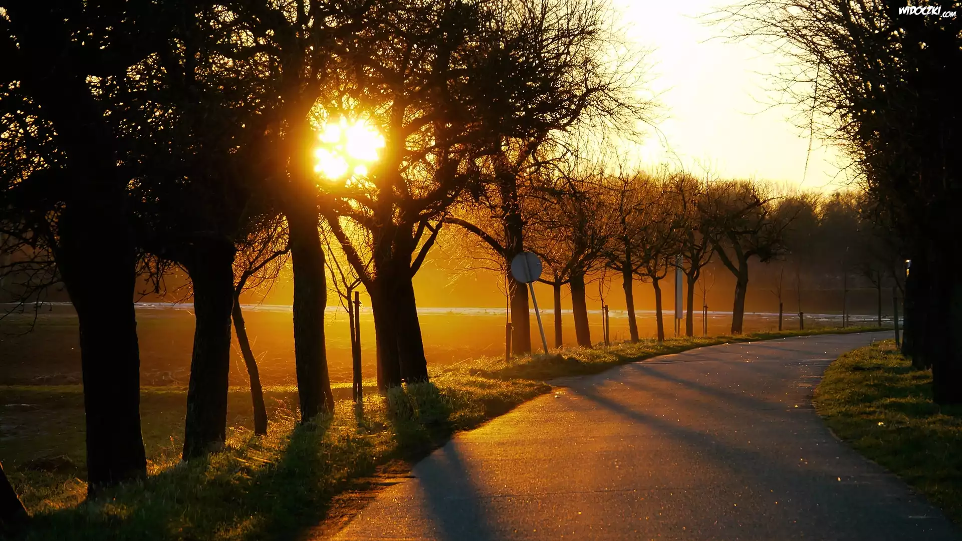 Zdjęcia, Zachód Słońca, Drzewa, Promienie, Droga