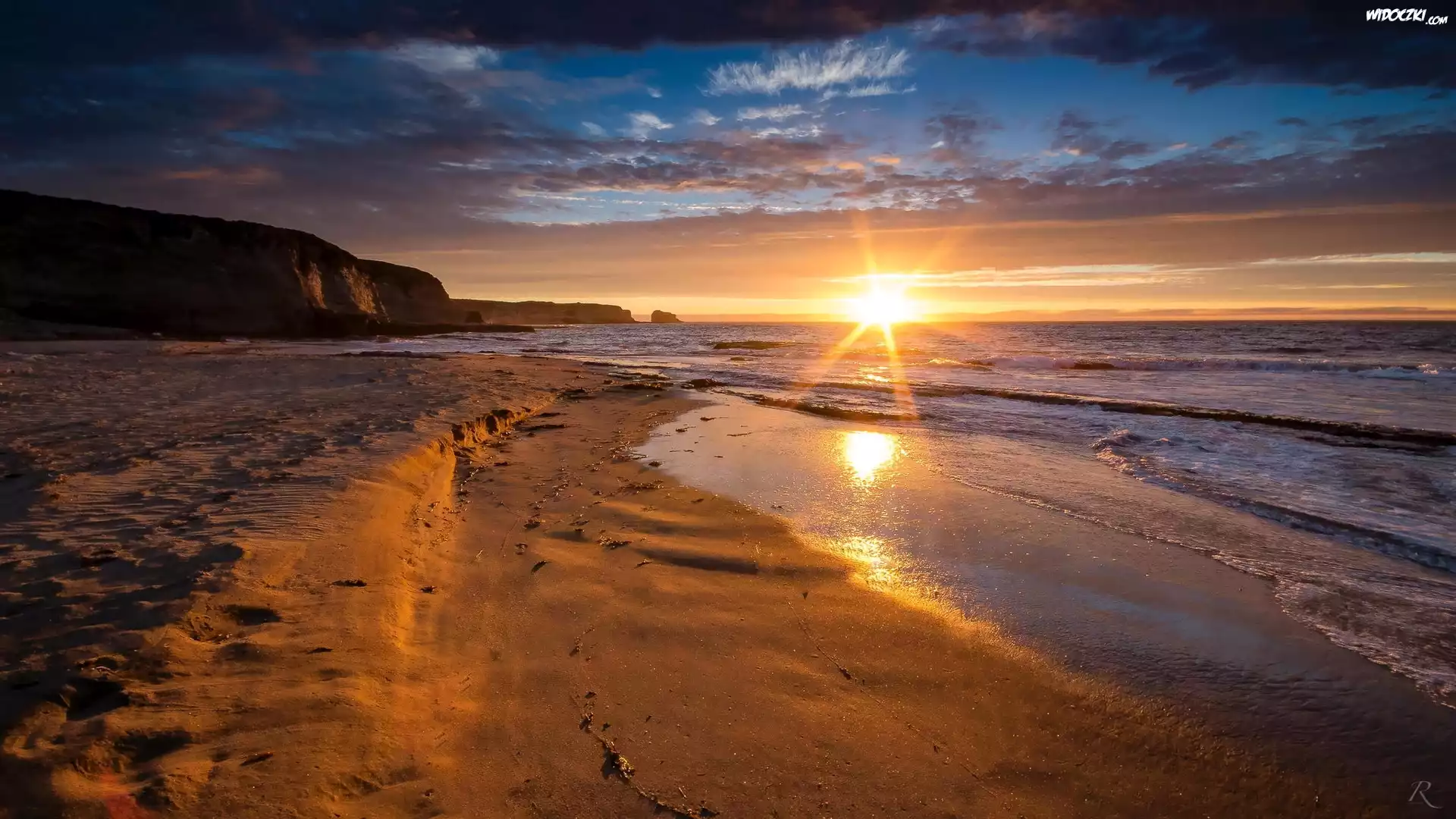 Zachód słońca, Plaża, Morze, Promienie słońca