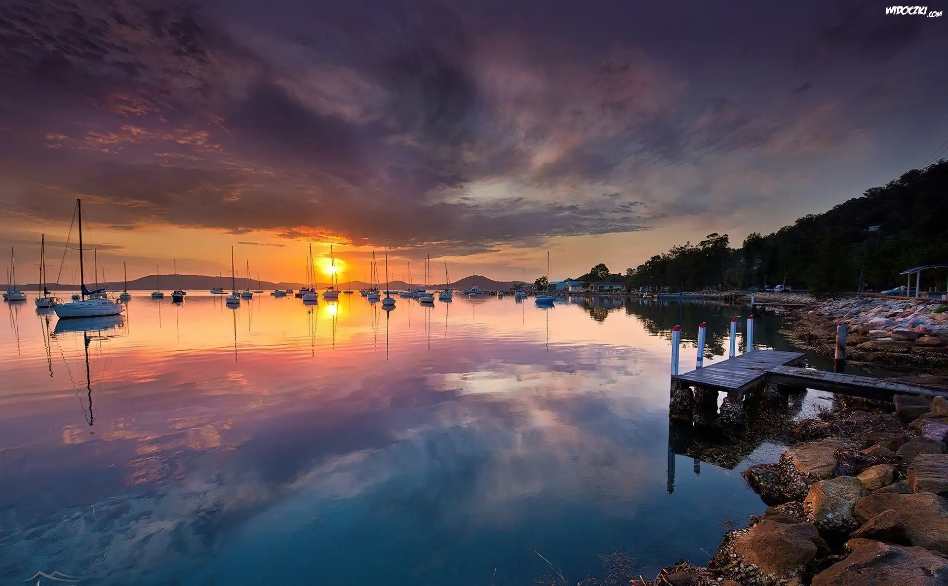 Zdjęcia, Zachód, Słońca, Przystań, Jachty