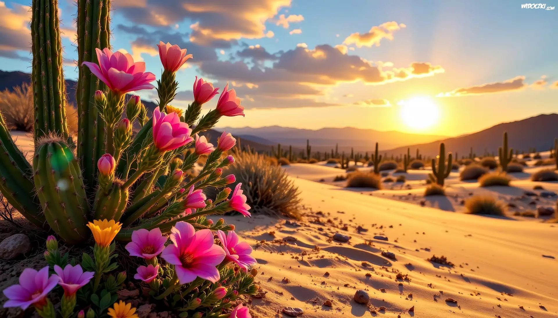 Kaktus, Kwiaty, Pustynia, Zachód słońca, Grafika AI
