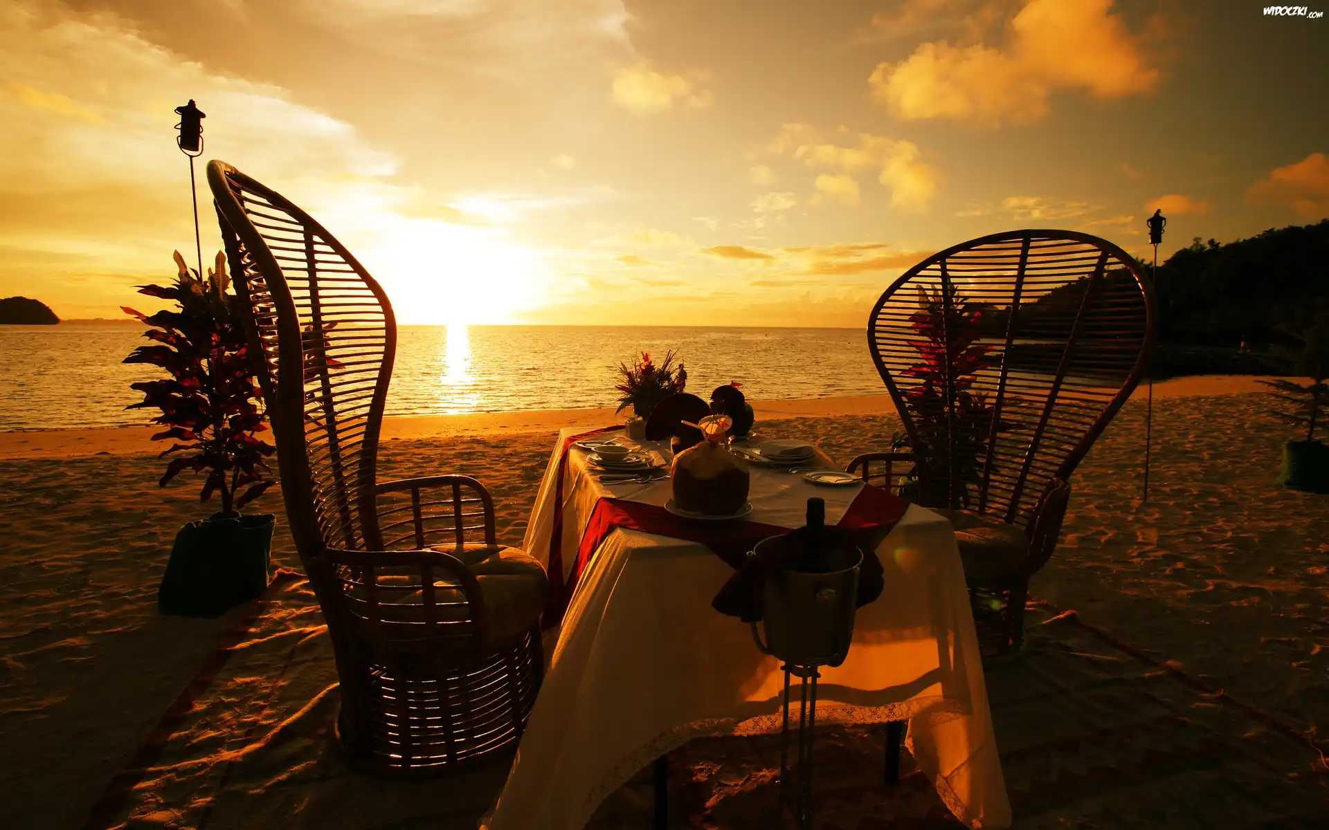 Zdjęcia, Zachód, Słońca, Plaża, Romantyczna, Kolacja