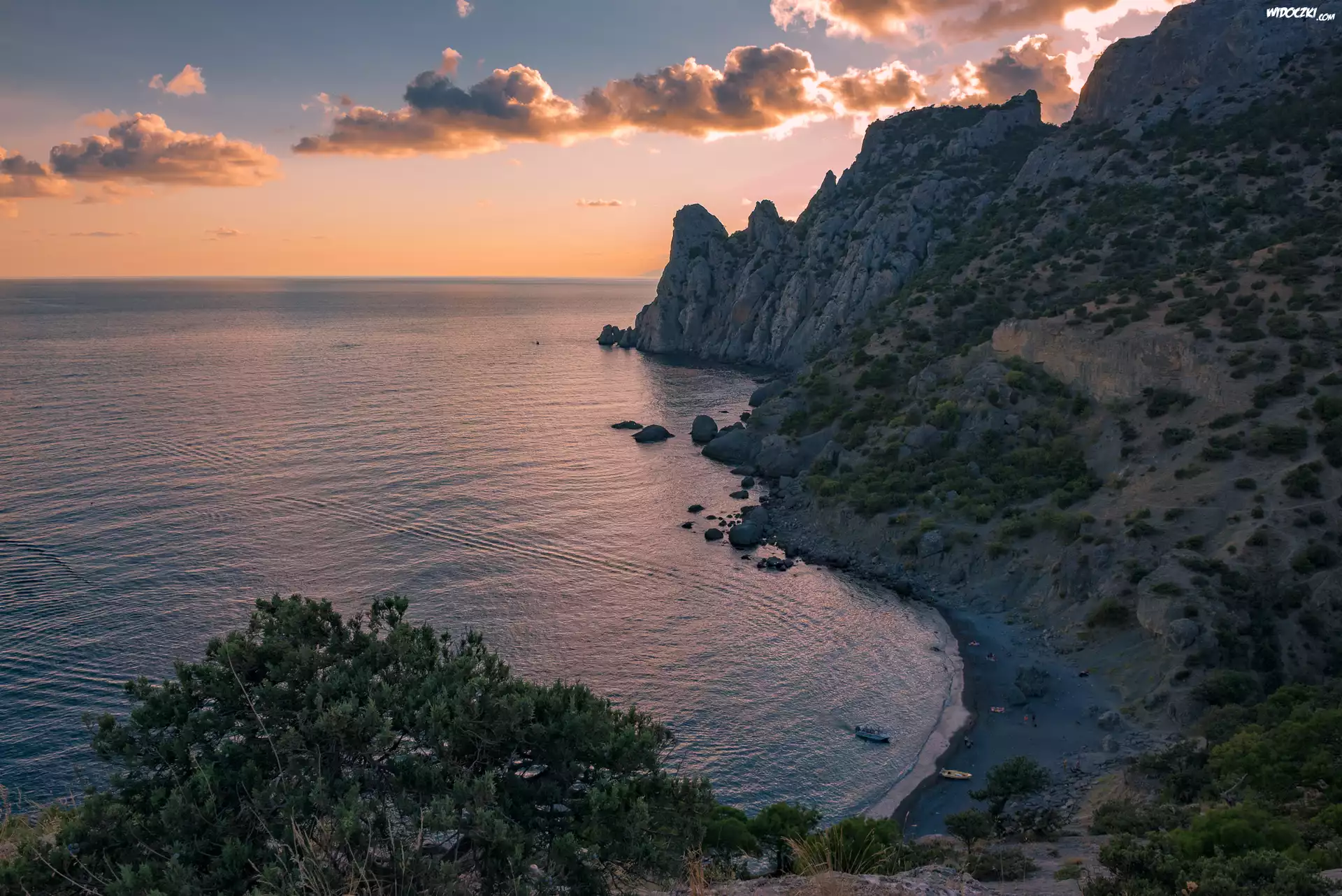 Zdjęcia, Morze, Zachód słońca, Chmury, Brzeg, Skały, Drzewa, Rośliny