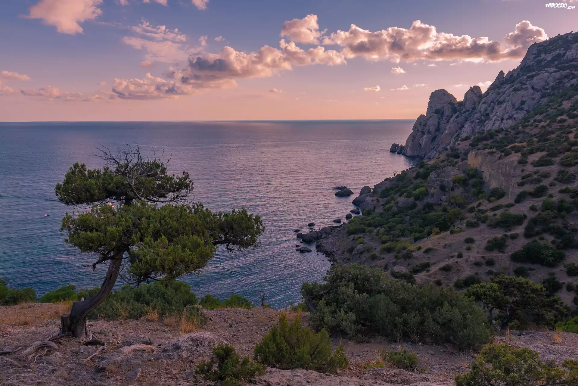 Morze, Zachód słońca, Chmury, Brzeg, Skały, Drzewo, Rośliny