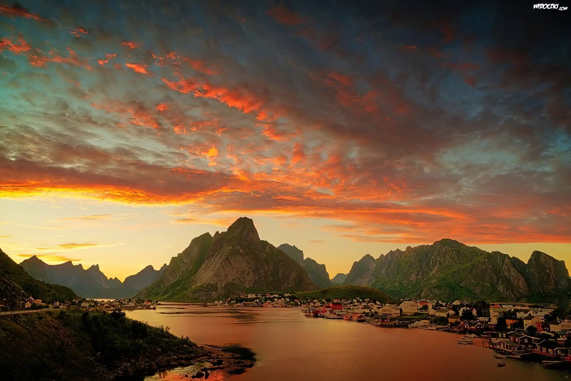 Zdjęcia, Zachód, Słońca, Chmury, Góry, Rzeka, Miasteczko