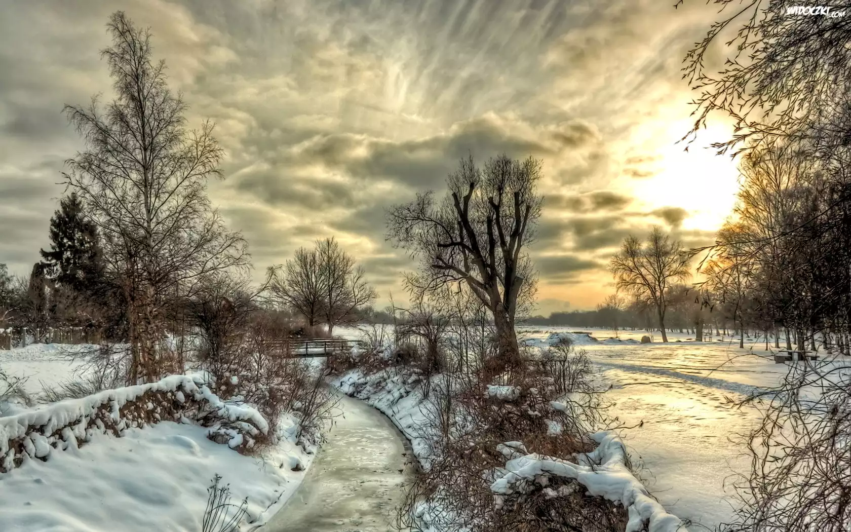 Zdjęcia, Zachód, Słońca, Drzewa, Rzeka, Zima