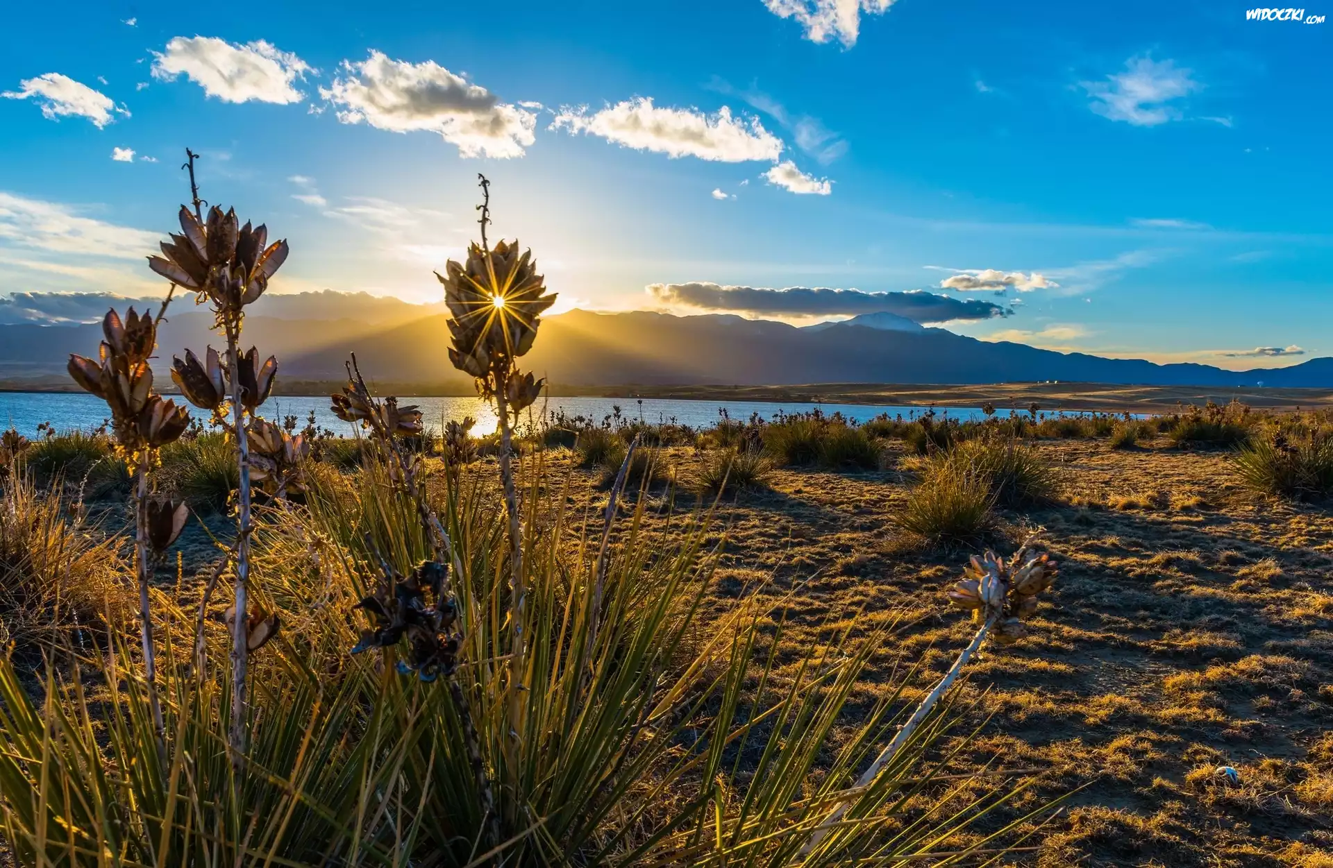 Zdjęcia, Zachód, Słońca, Góry, Rzeka, Rośliny