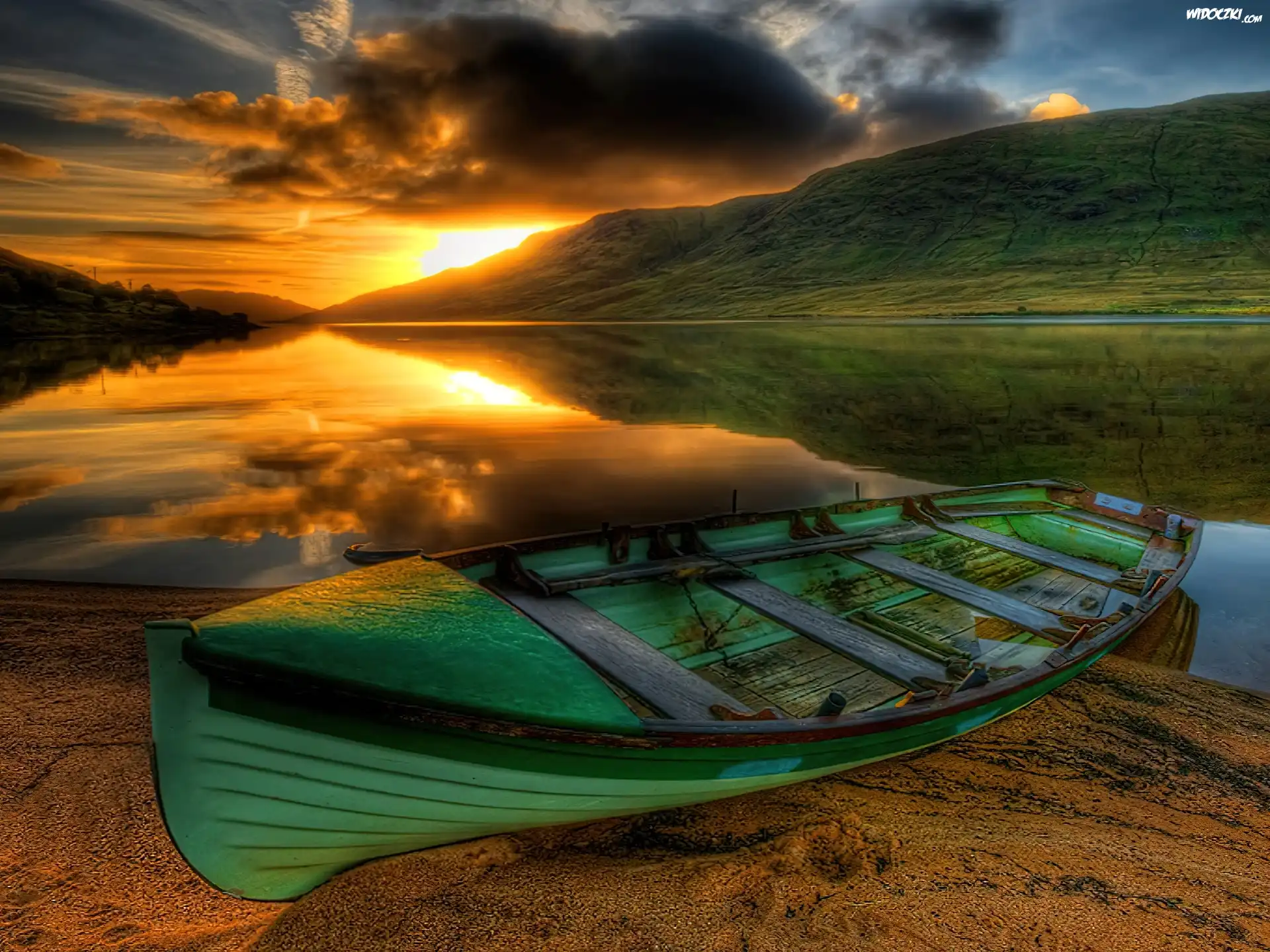 Zachód, Słońca, Rzeka, Łajba