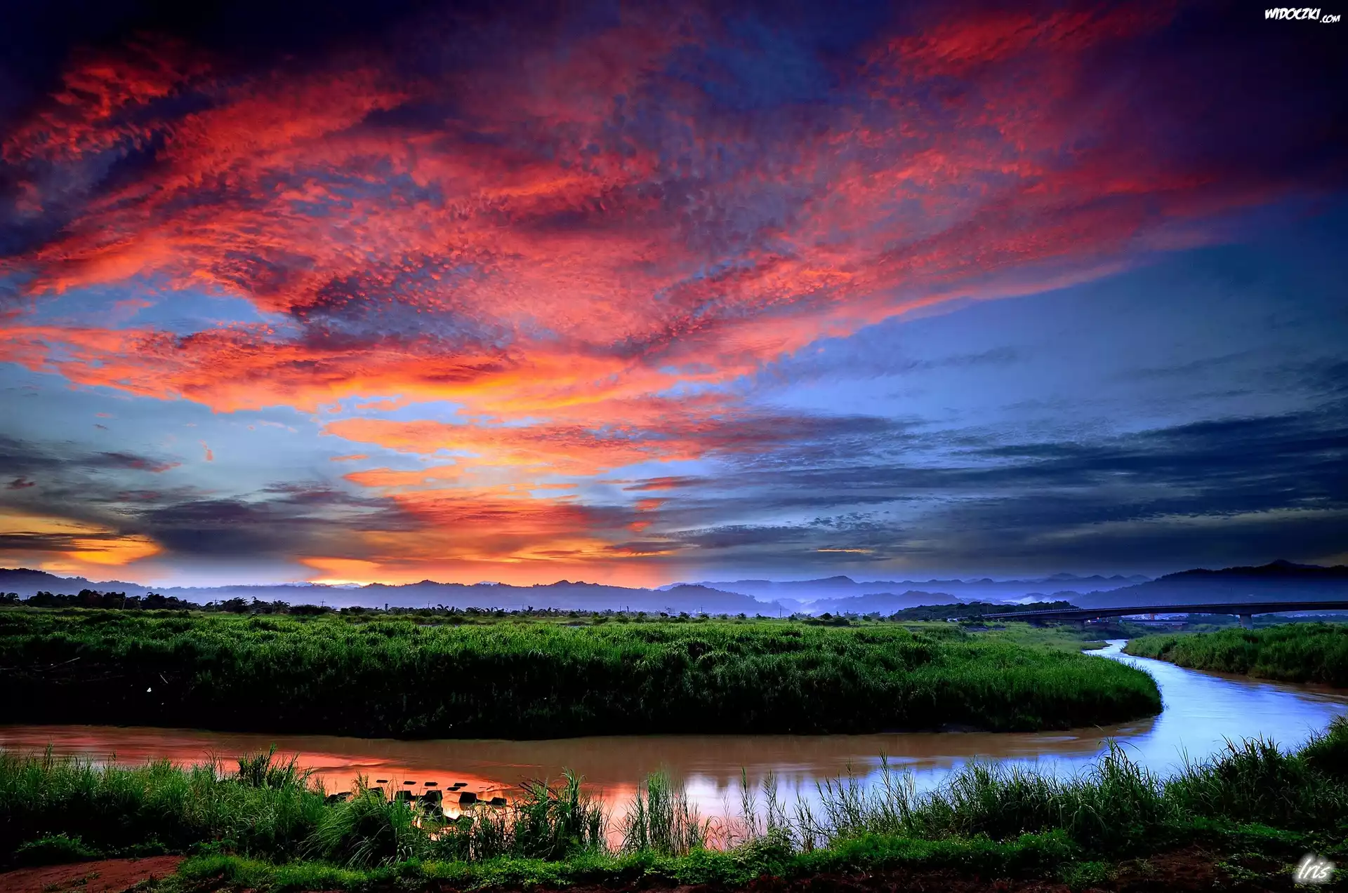 Zdjęcia, Zachód, Słońca, Rzeka, Rośliny