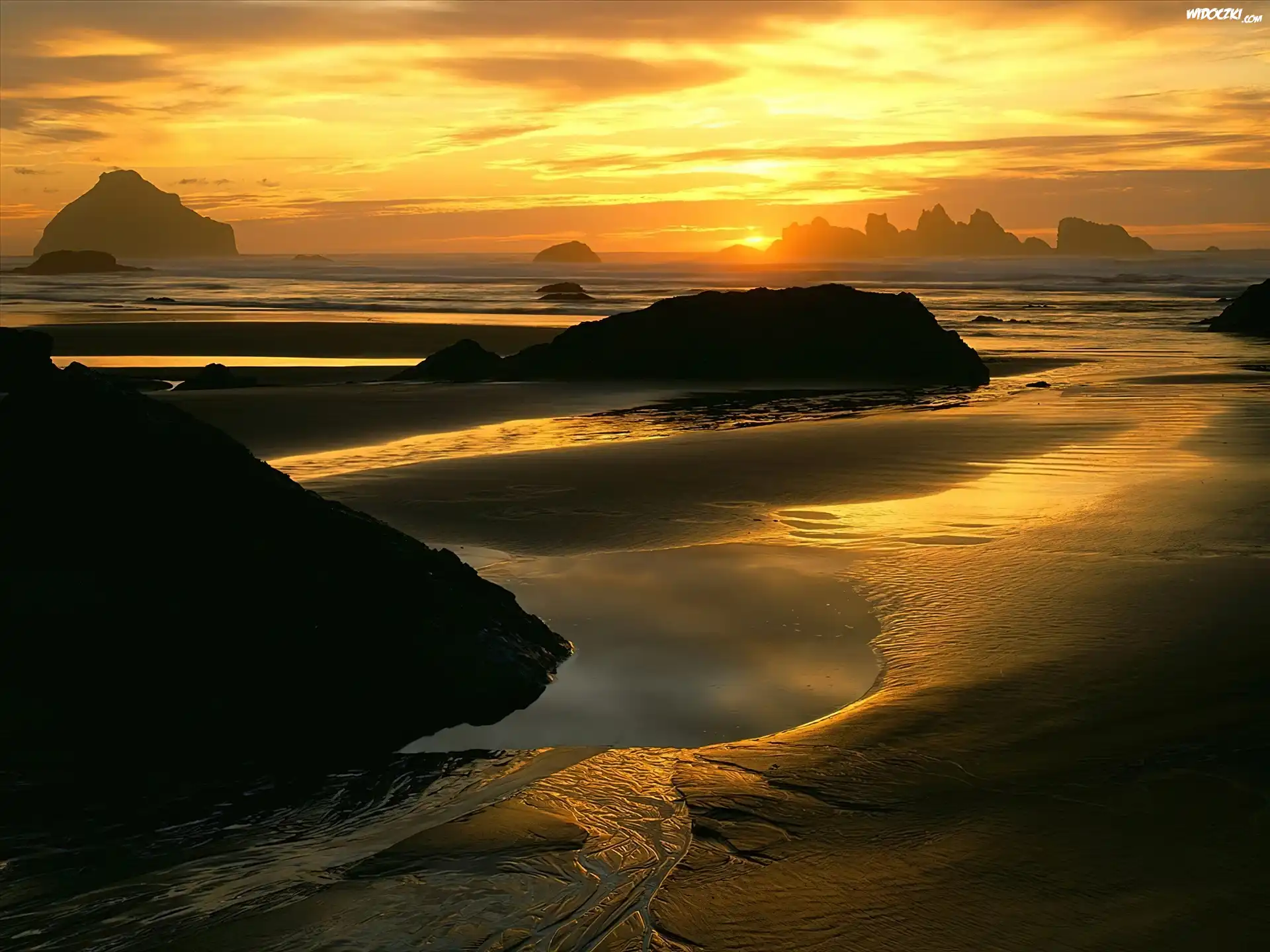 Zdjęcia, Zachód, Słońca, Plaża, Skałki, Kamienie