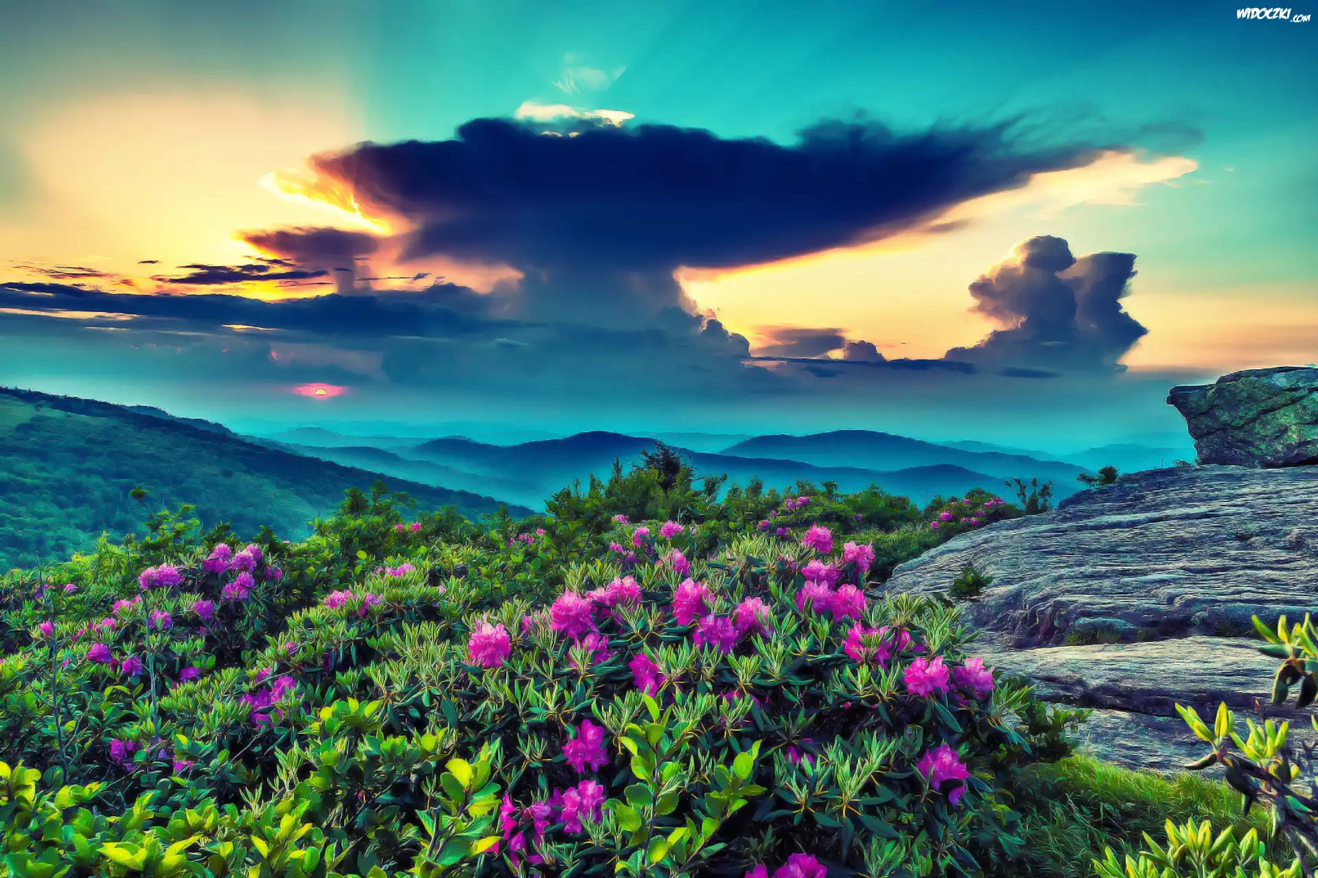 Zachód, Słońca, Chmury, Skały, Kwiaty